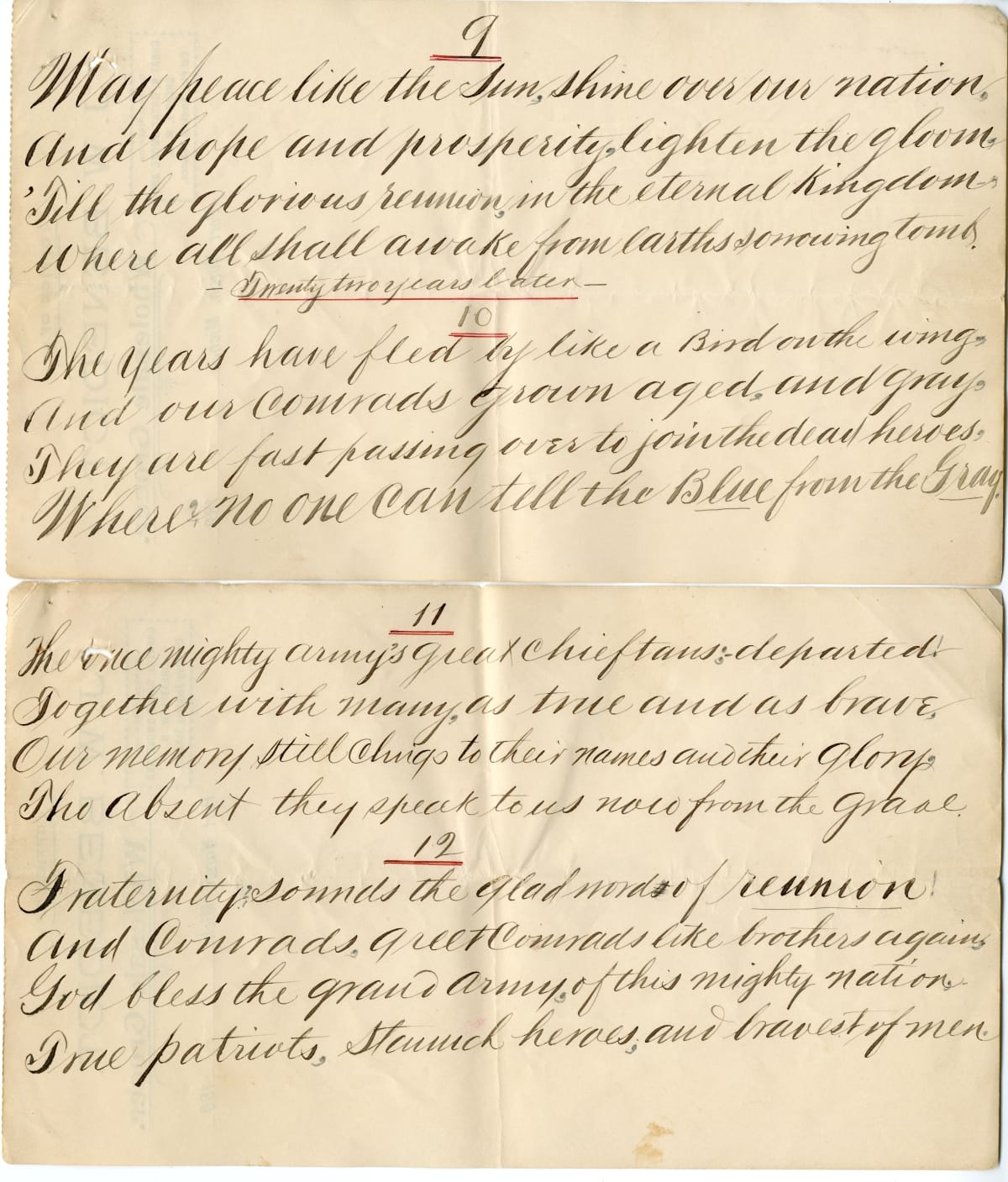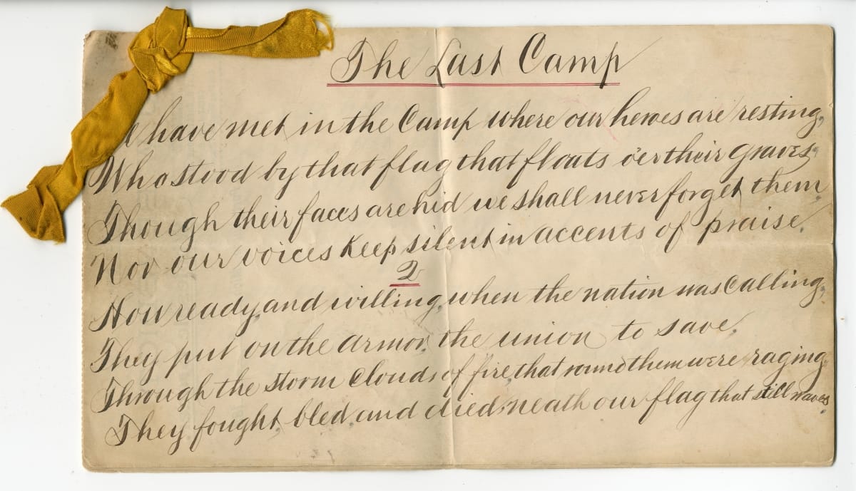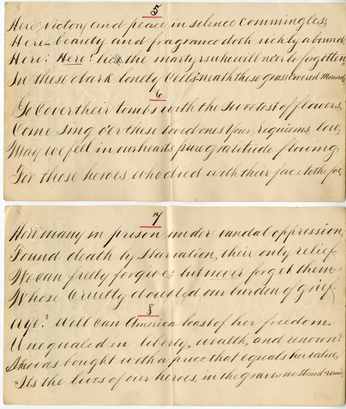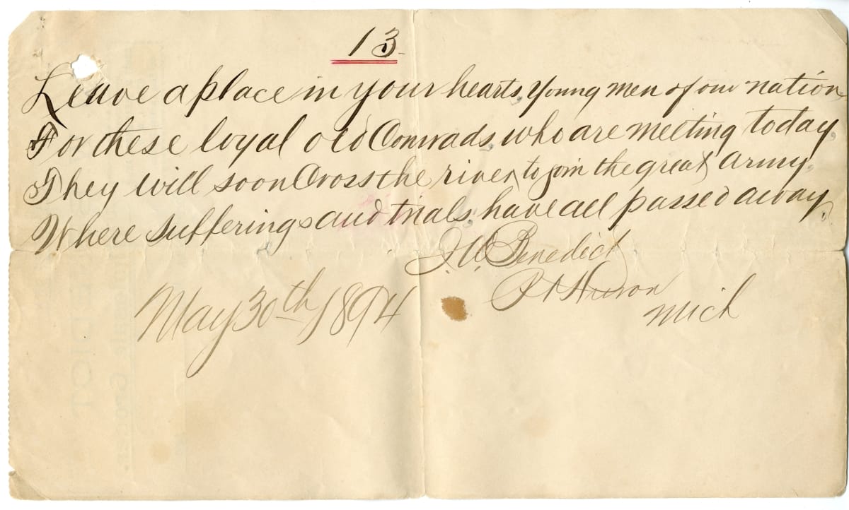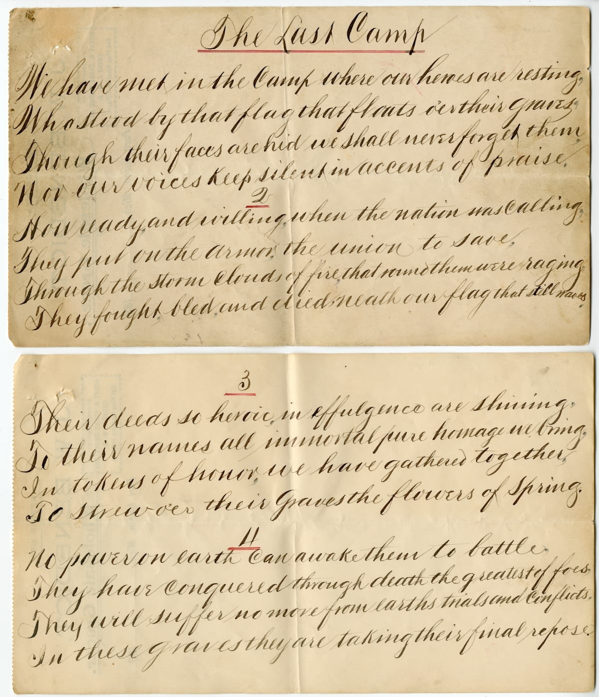 This poem, written by J. Wesley Benedict, was read at a Memorial Day gathering in Port Huron, Michigan, in 1894. Benedict expressed gratitude for the sacrifices made by those who had fought the Civil War. The first nine stanzas, written in 1872, reflect the hardship of war and cost of freedom. The remaining four stanzas, added twenty years later, focus on reconciliation.