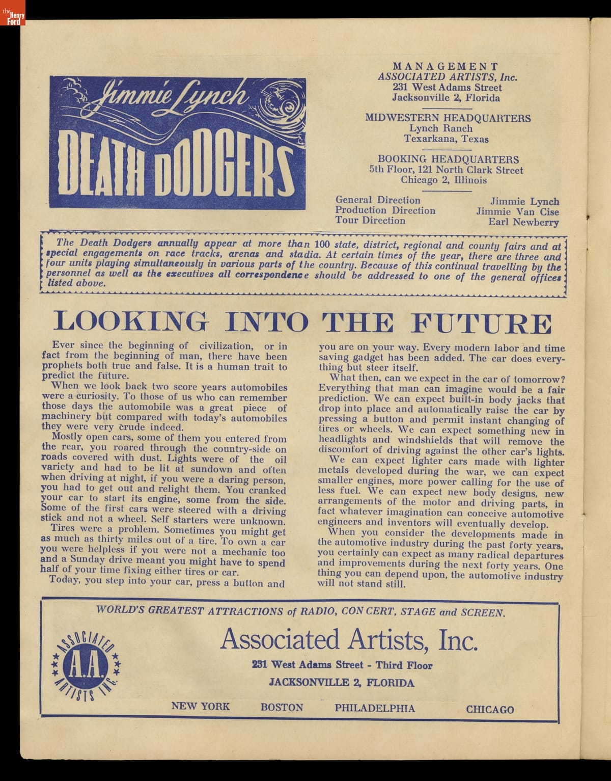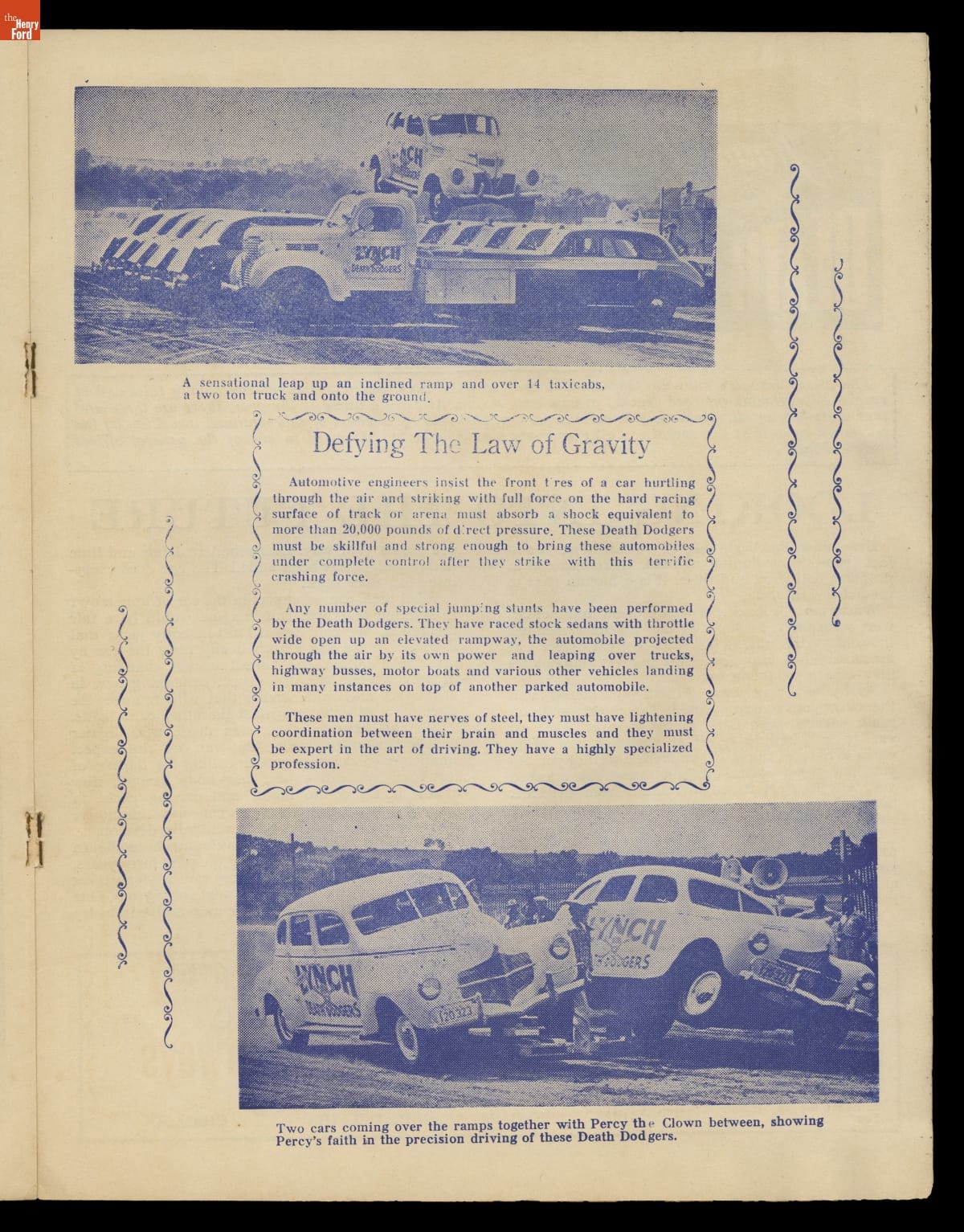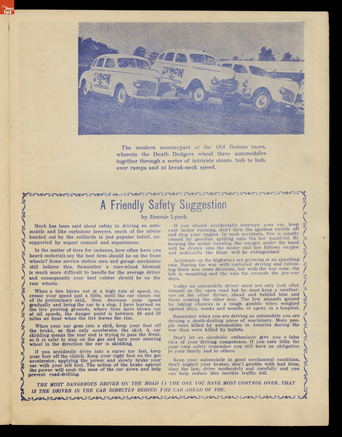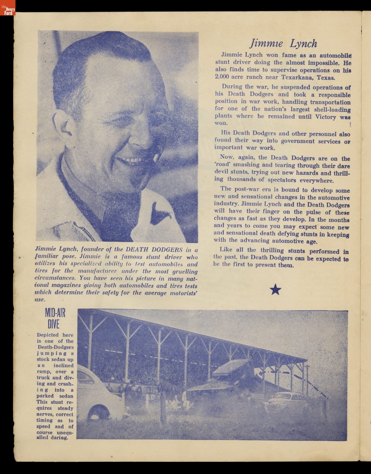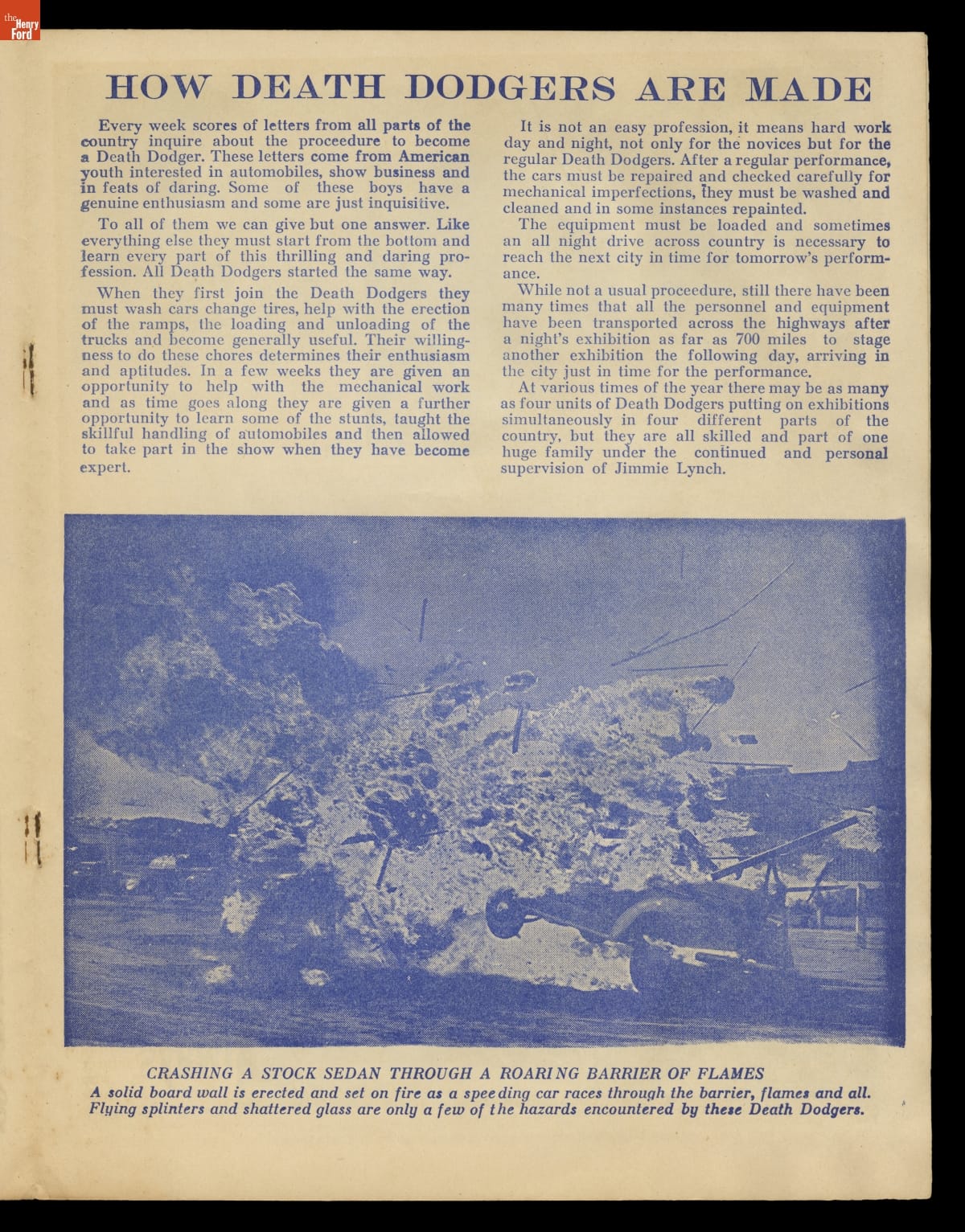 Jimmie Lynch, automobile daredevil and stunt car performer, began his career in the 1930s. He and his troop of Death Dodgers toured the country crashing cars and entertaining the public. Though rollovers, crashes and stunts were basic elements of daredevil thrill shows, Lynch also promoted automobile safety. He performed tests for the National Safety Council and educated the public on how and how not to drive.