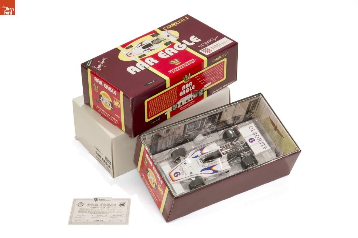 On ends of inner boxes: AAR EAGLE/ CAROUSEL 1/ 1:18 Scale/ #4706/ 1972 Indianapolis 500 Pole/ #6 - Bobby Unser/ Olsonite Eagle