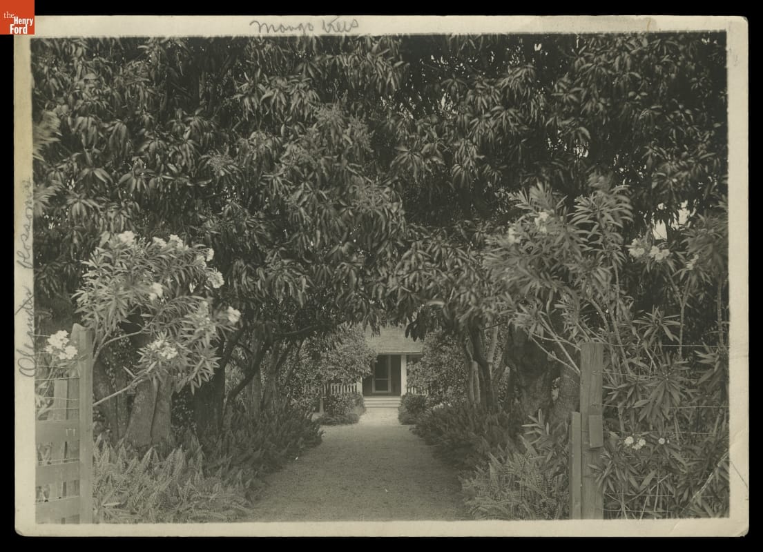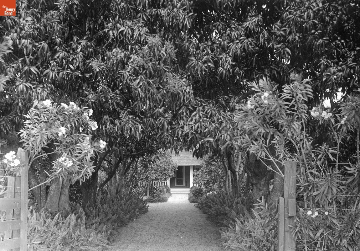 This is the view to Henry and Clara Ford's vacation home along the Caloosahatchee River in Fort Myers, Florida. Ford purchased the property, which neighbored his friend Thomas Edison's winter retreat, in 1916. The Fords named the estate "The Mangoes" and surrounded their newly built bungalow with tropical landscaping, including the mango and oleander plants seen here.