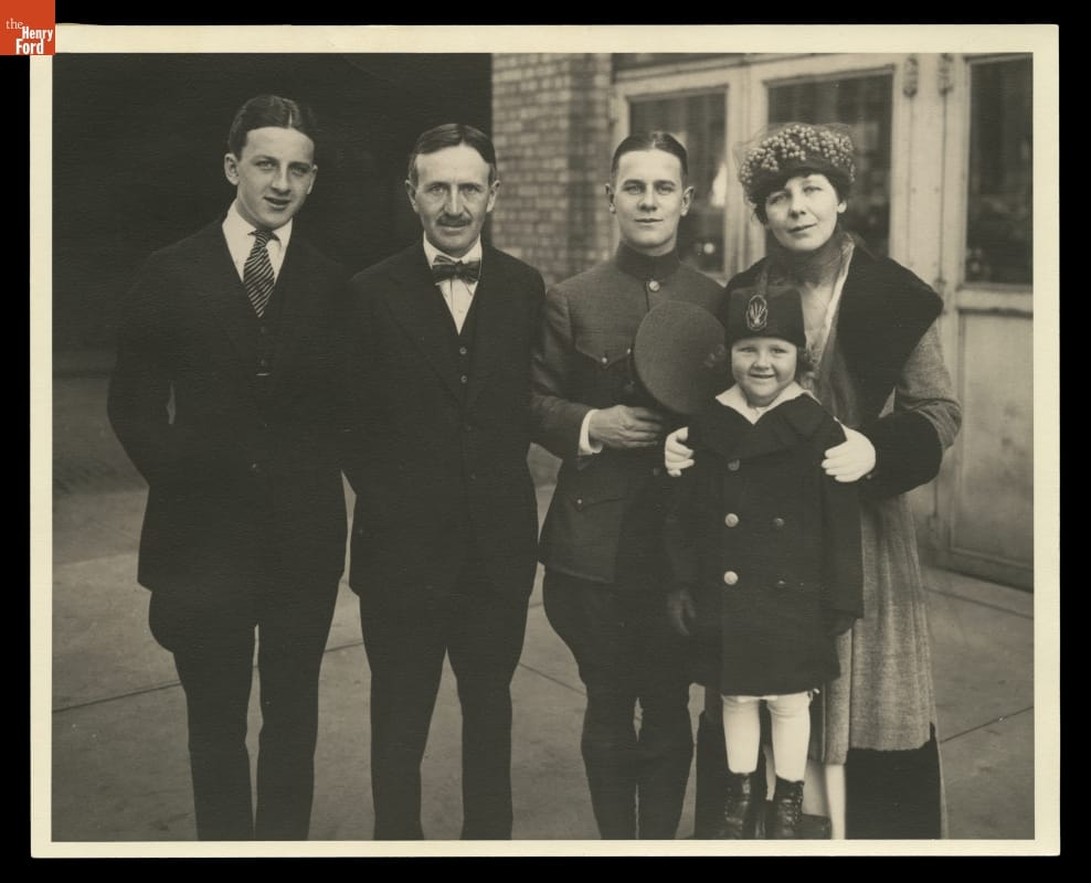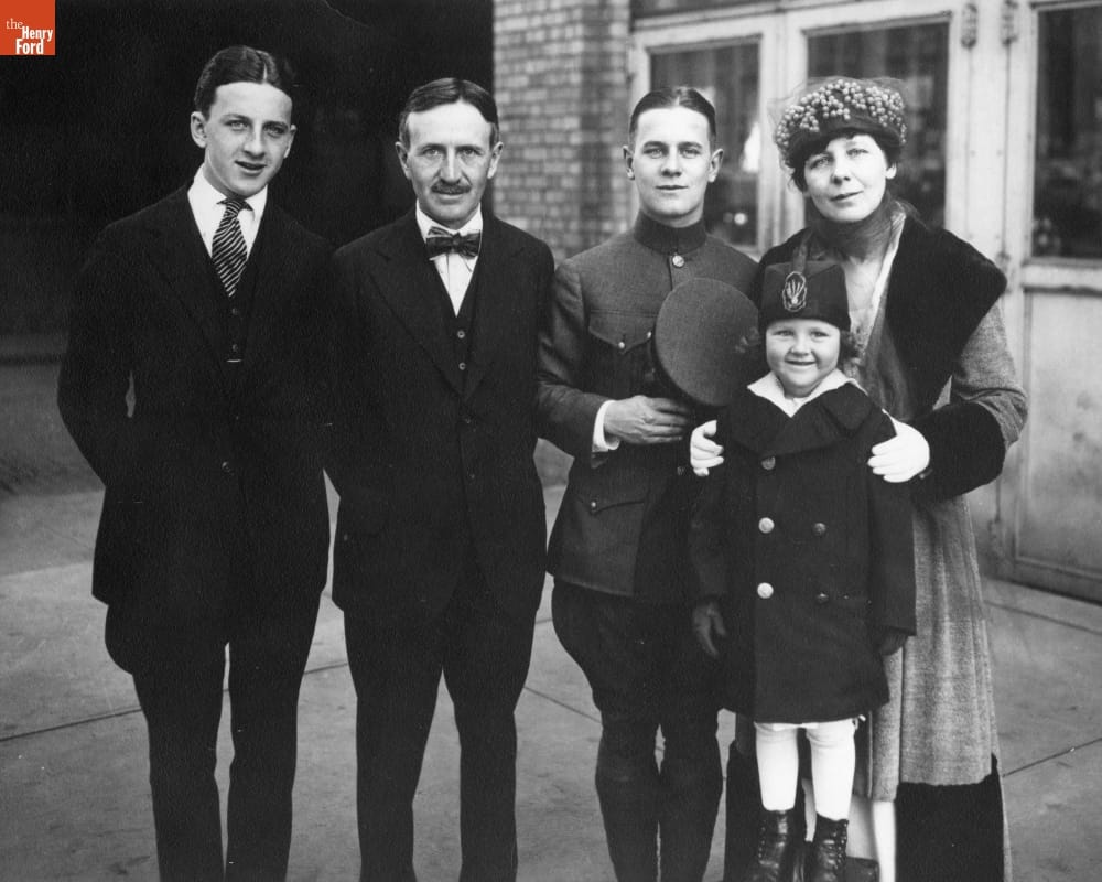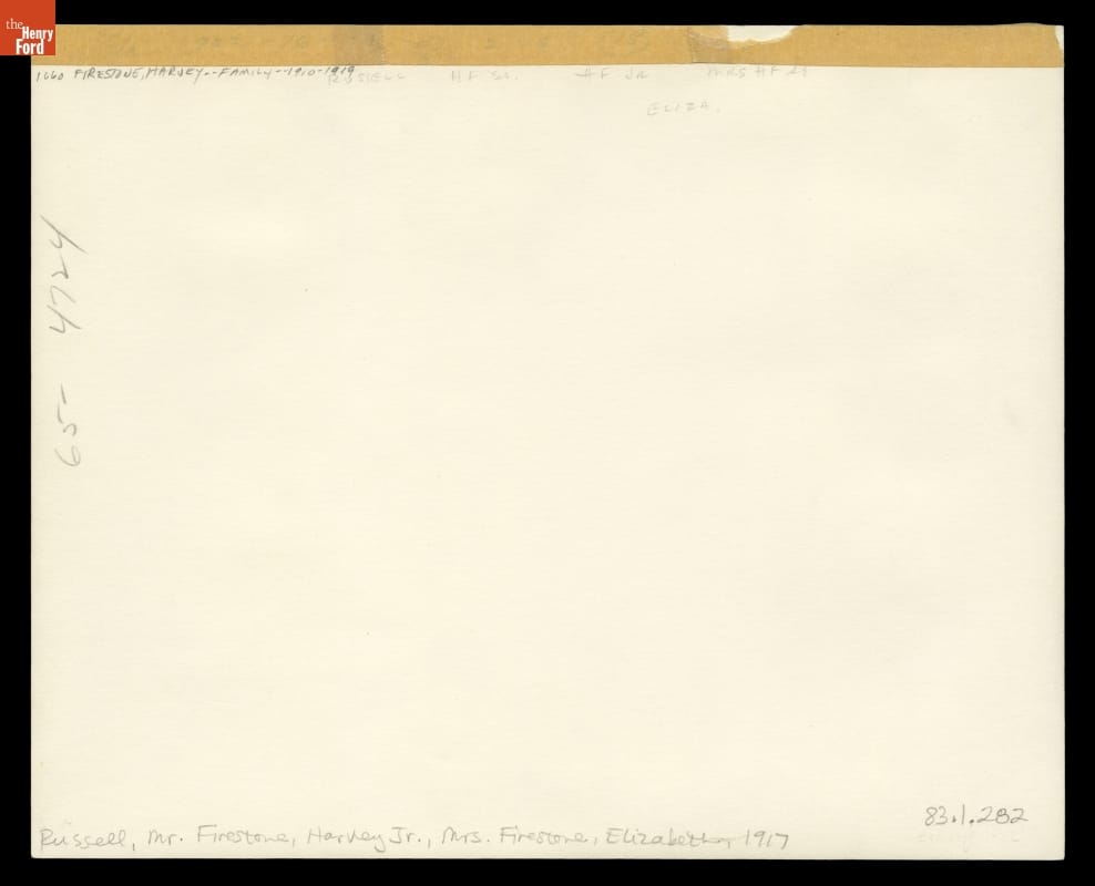 This informal family portrait shows Harvey and Idabelle Firestone with three of their children: Russel, Harvey, and Elizabeth. The younger Harvey - seen here in uniform - served as a naval aviator in World War I. Later, he took over operations of the Firestone Tire and Rubber Company, which had been founded by his father in 1900.