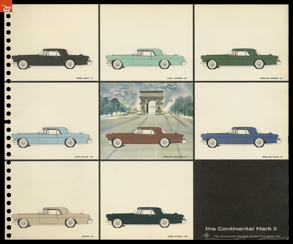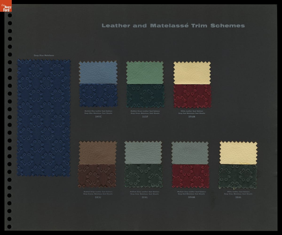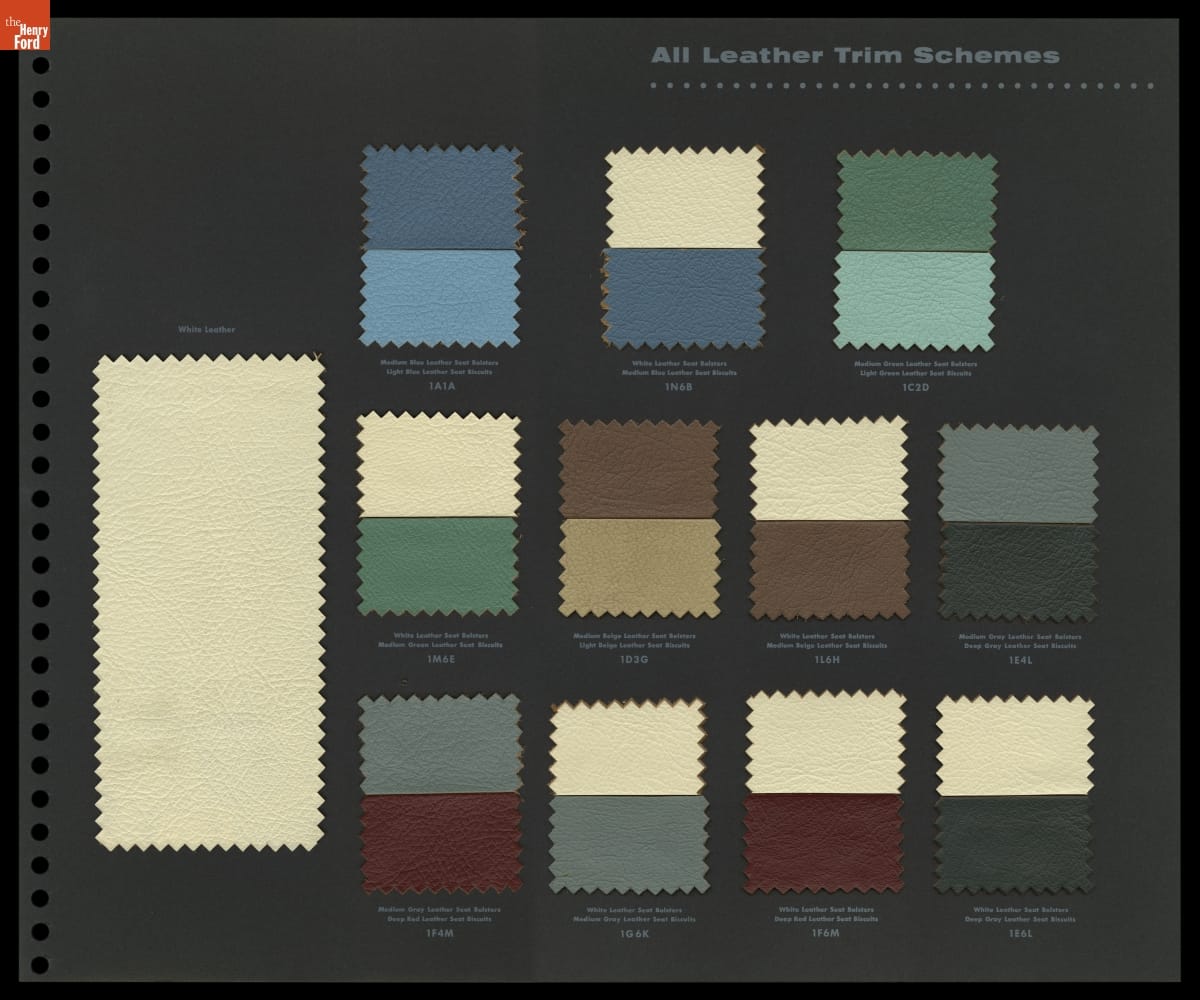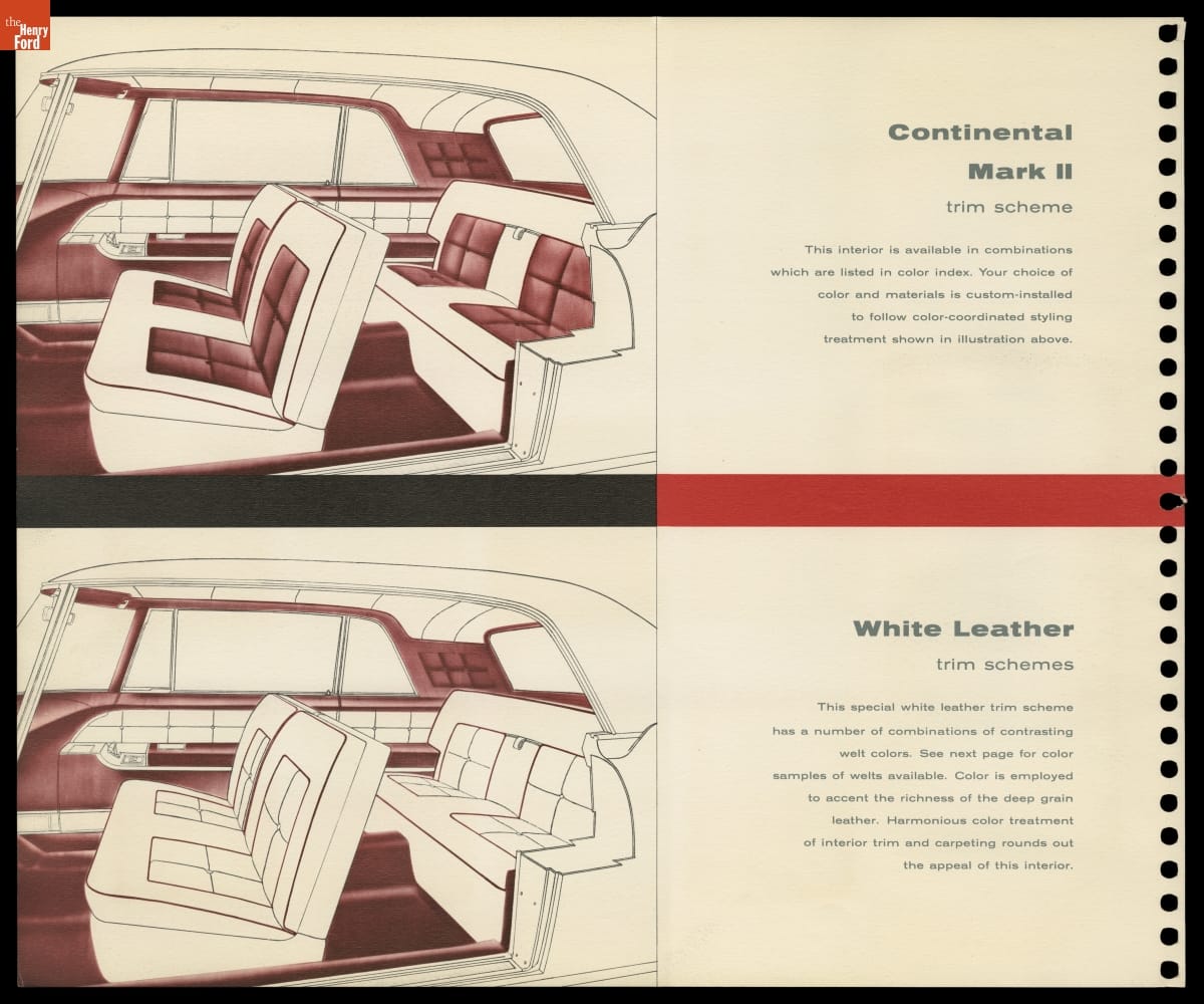 Pages from this color and trim book helped customers imagine their new Continental Mark II. Potential buyers could mix and match colors, textures, and materials available in their new vehicle.
