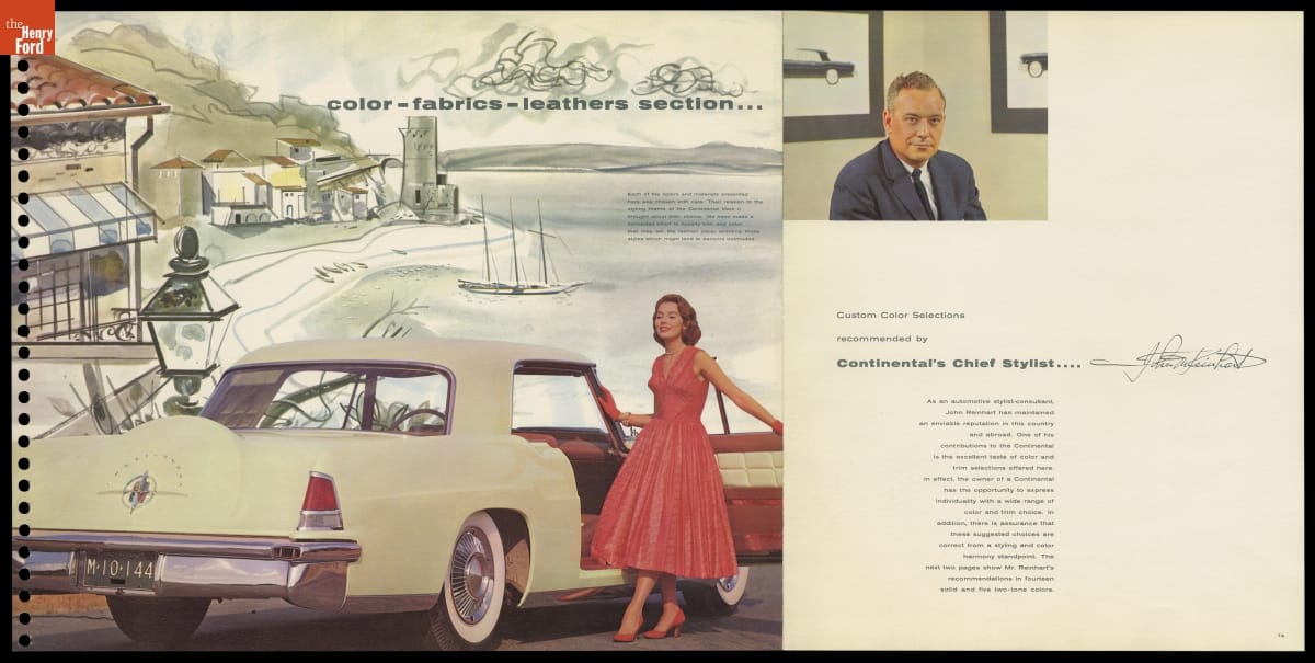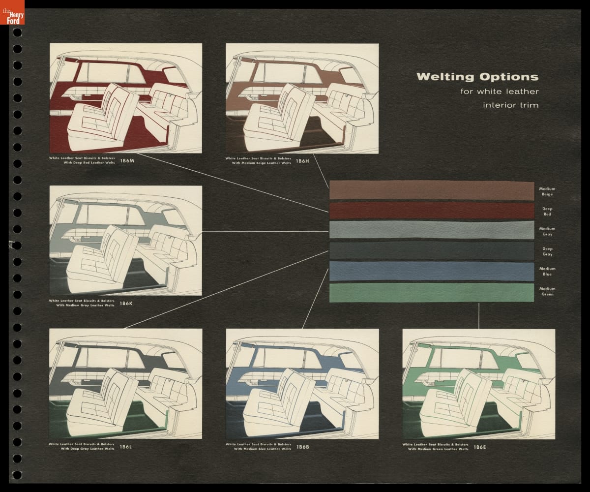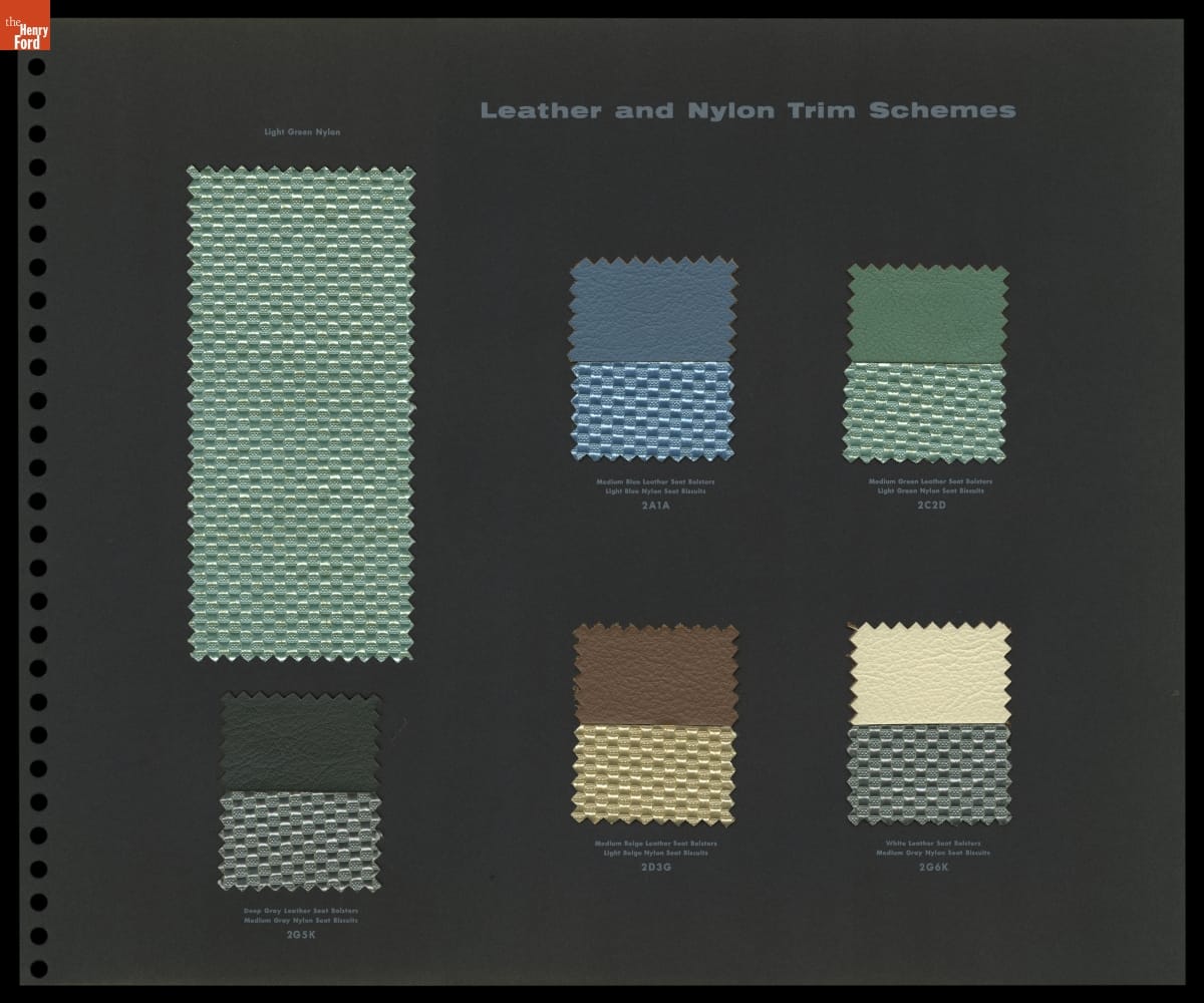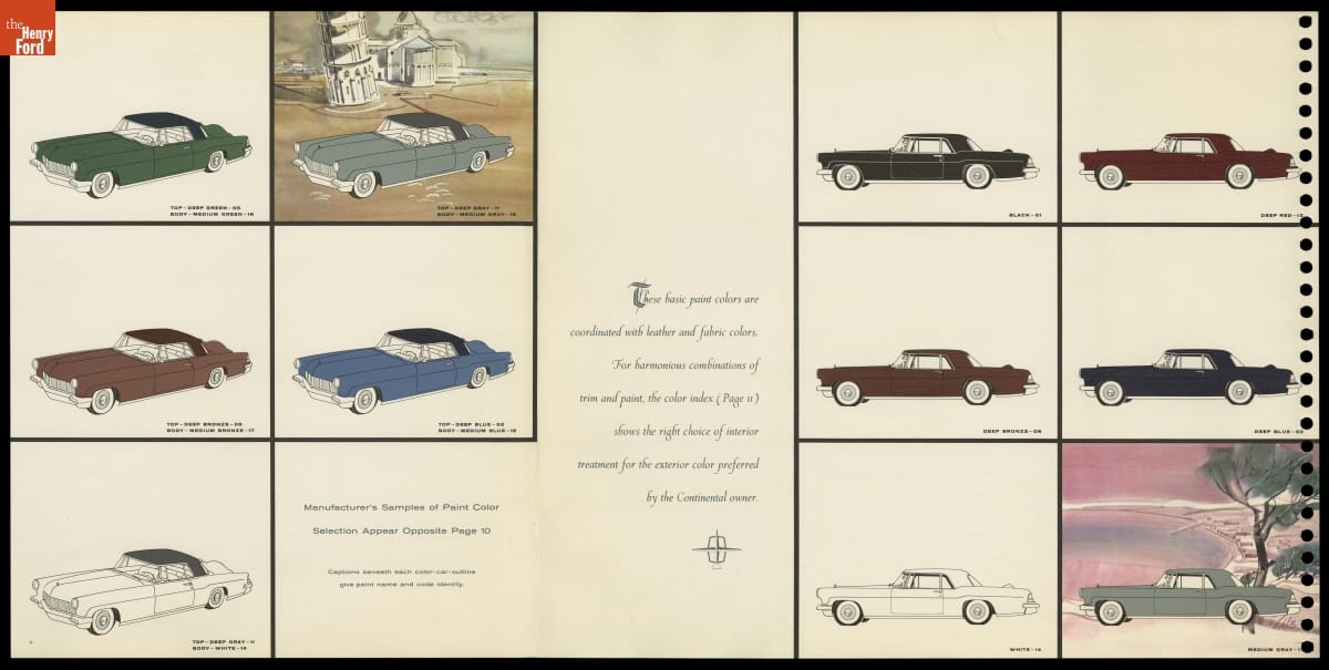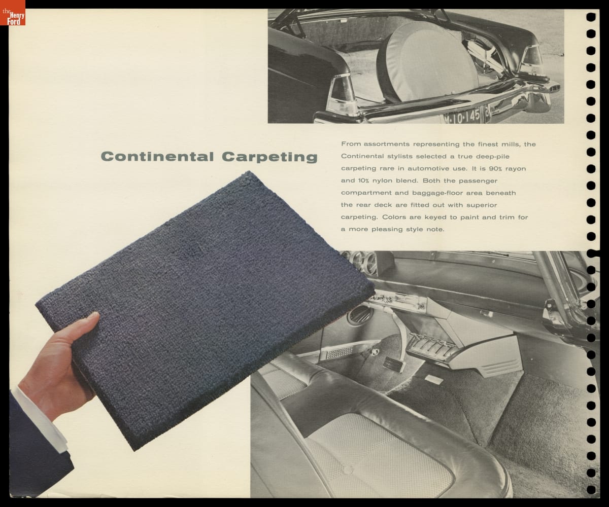 Pages from this color and trim book helped customers imagine their new Continental Mark II. Potential buyers could mix and match colors, textures, and materials available in their new vehicle.