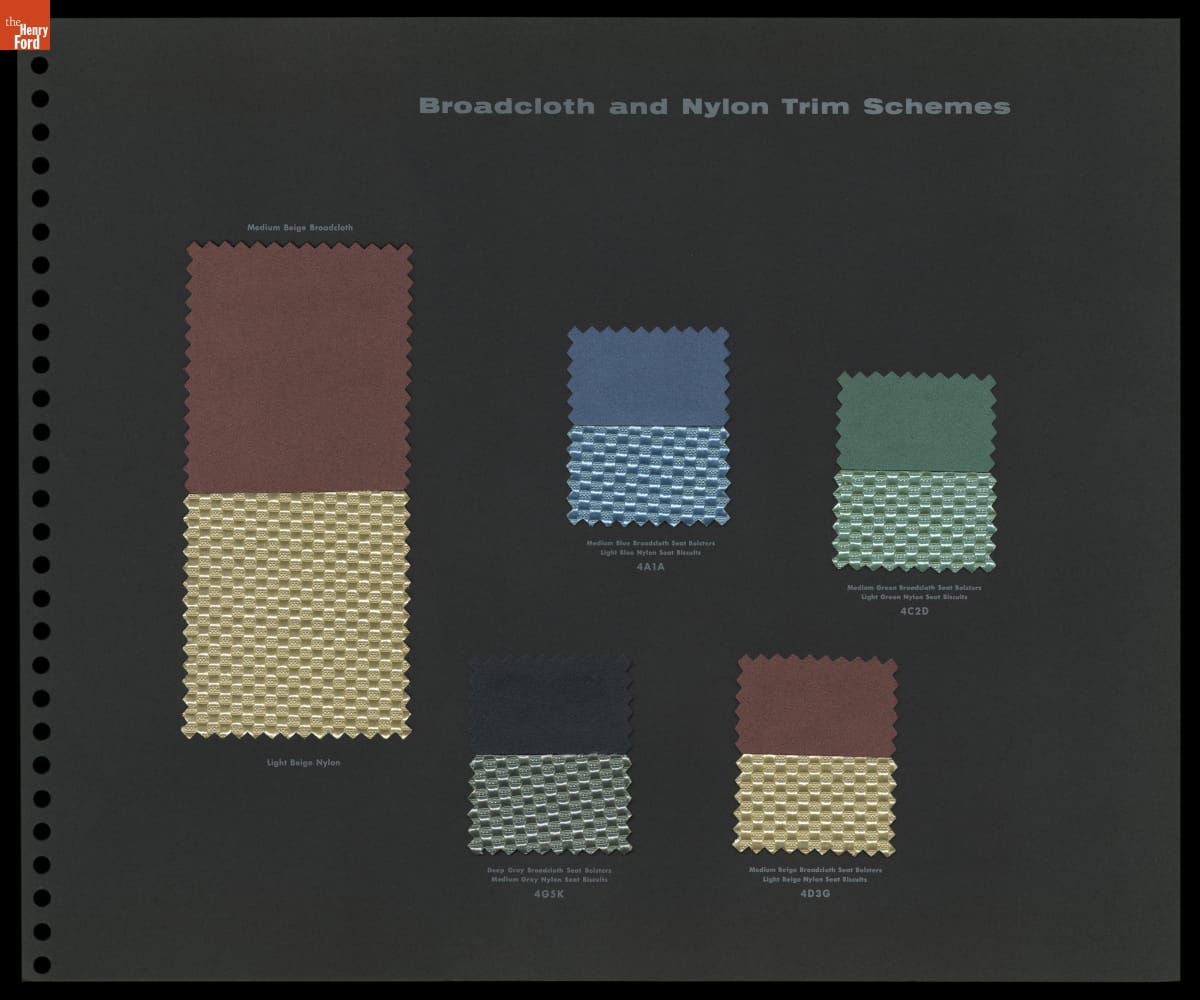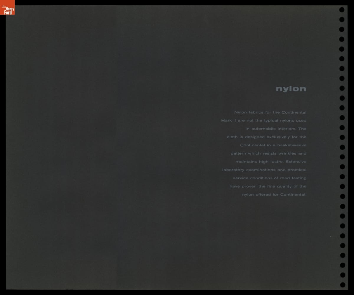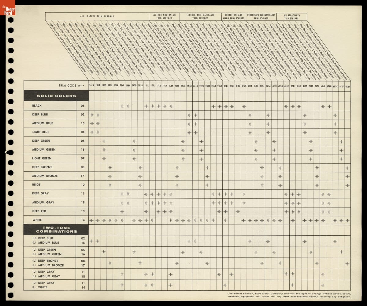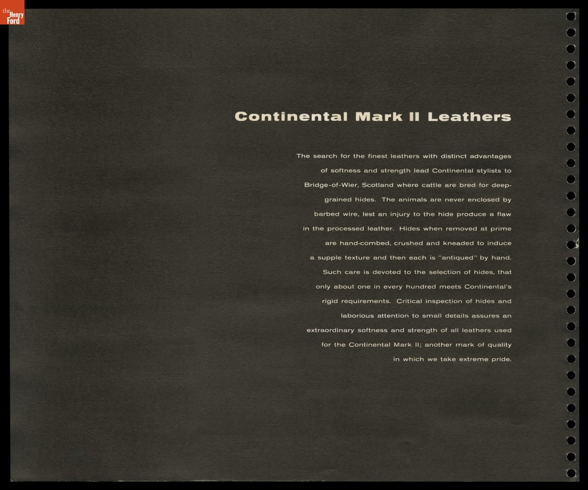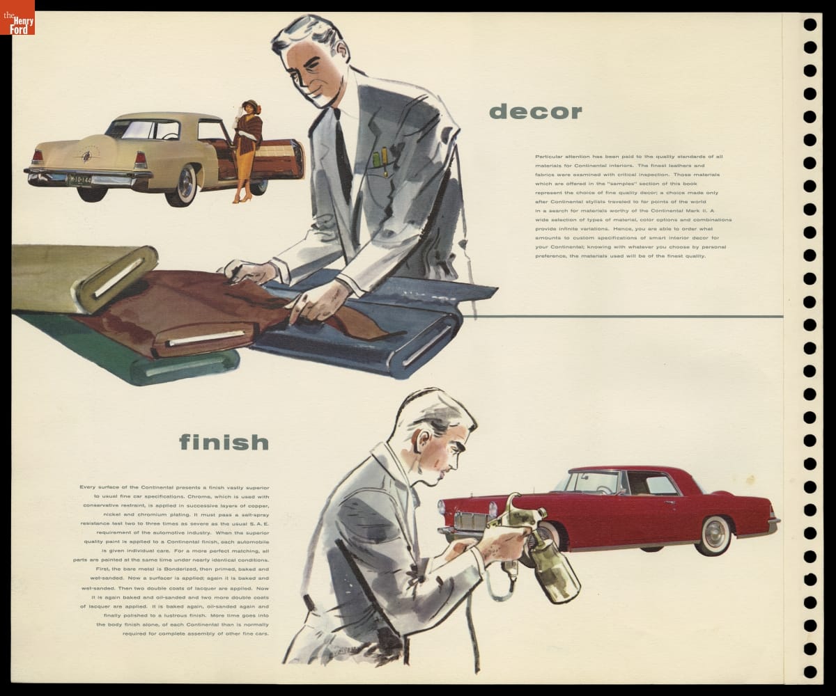 Pages from this color and trim book helped customers imagine their new Continental Mark II. Potential buyers could mix and match colors, textures, and materials available in their new vehicle.