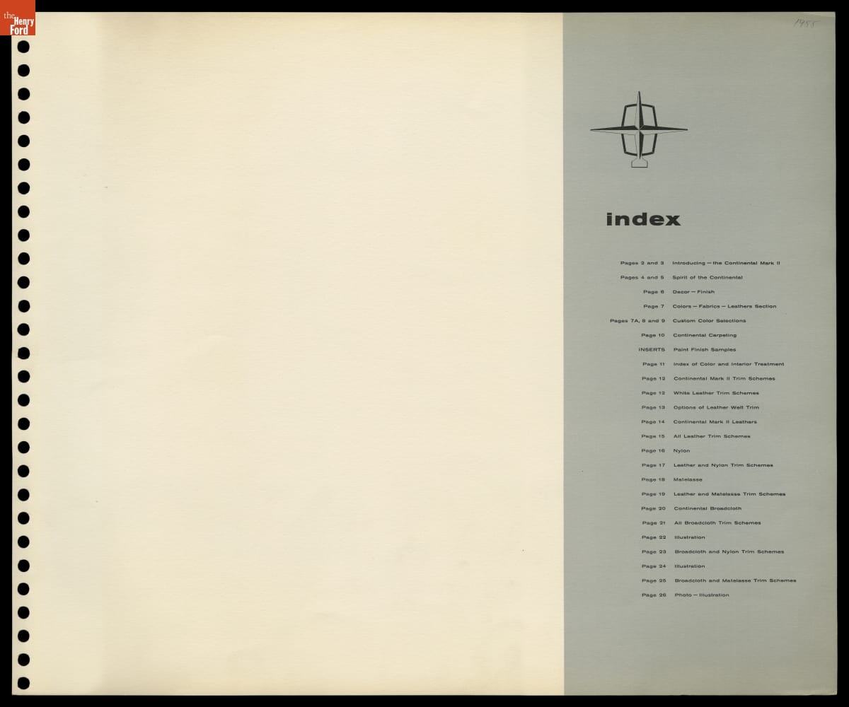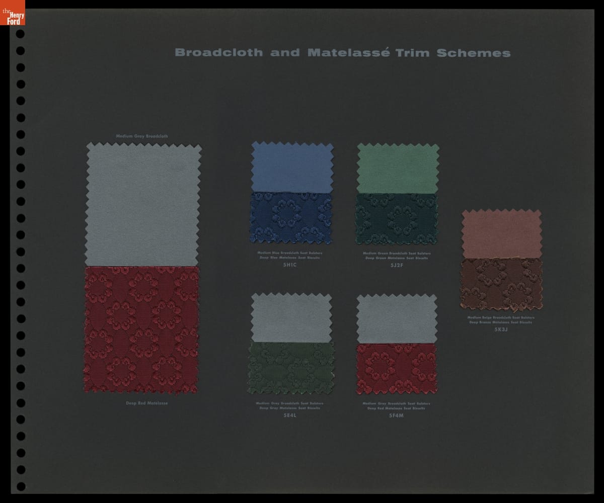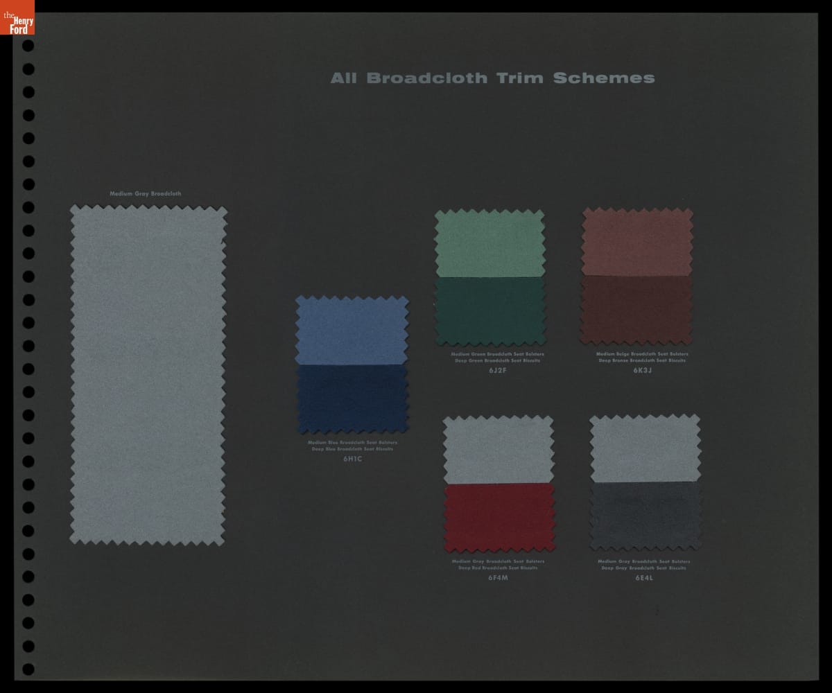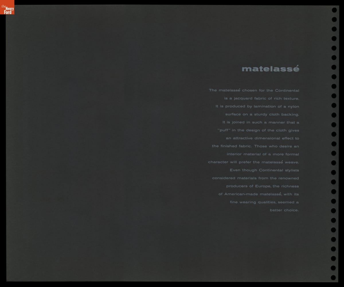 Pages from this color and trim book helped customers imagine their new Continental Mark II. Potential buyers could mix and match colors, textures, and materials available in their new vehicle.