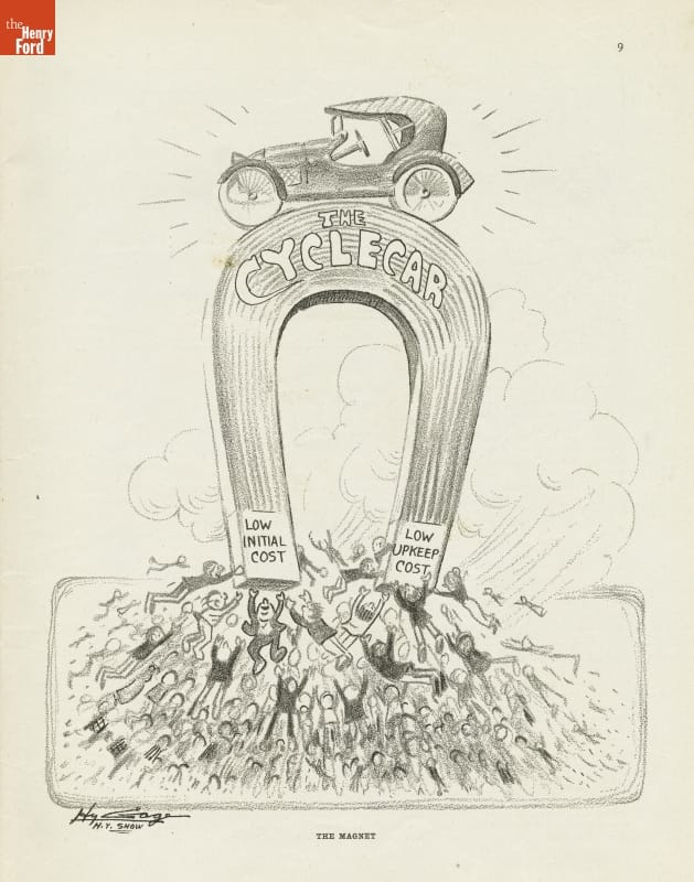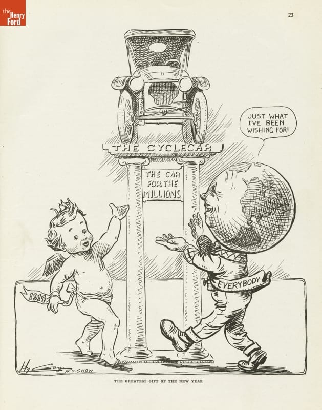 Cyclecars became so popular in the mid-1910s that there were magazines dedicated to them. The January 1914 issue of Cyclecar Age features several cartoons about the popular vehicle.