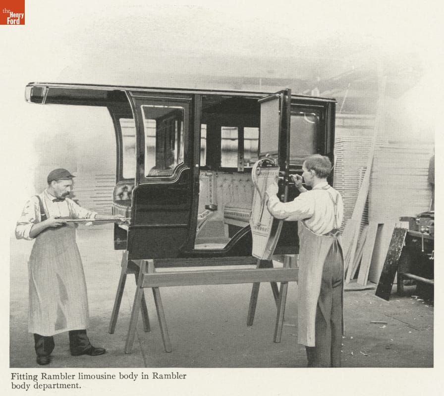 This issue of Rambler Magazine shows workers putting finishing touches on a limousine body in 1911. Before Henry Ford developed the moving automotive assembly line in 1913, cars were built at stations by workers moving from one vehicle to another.