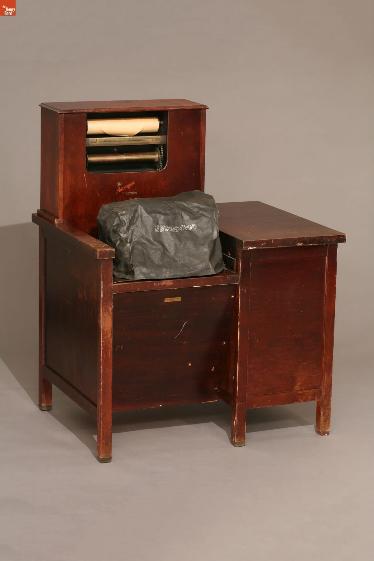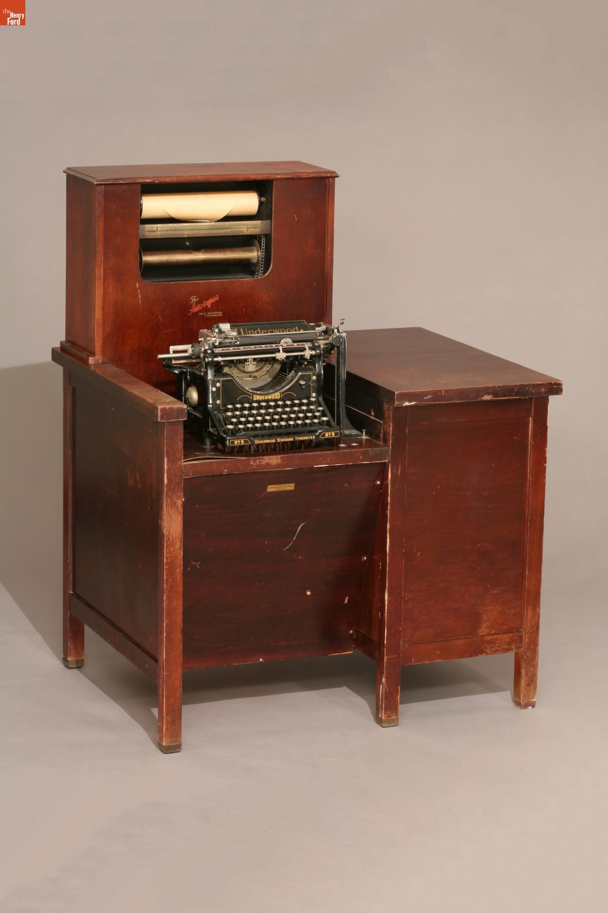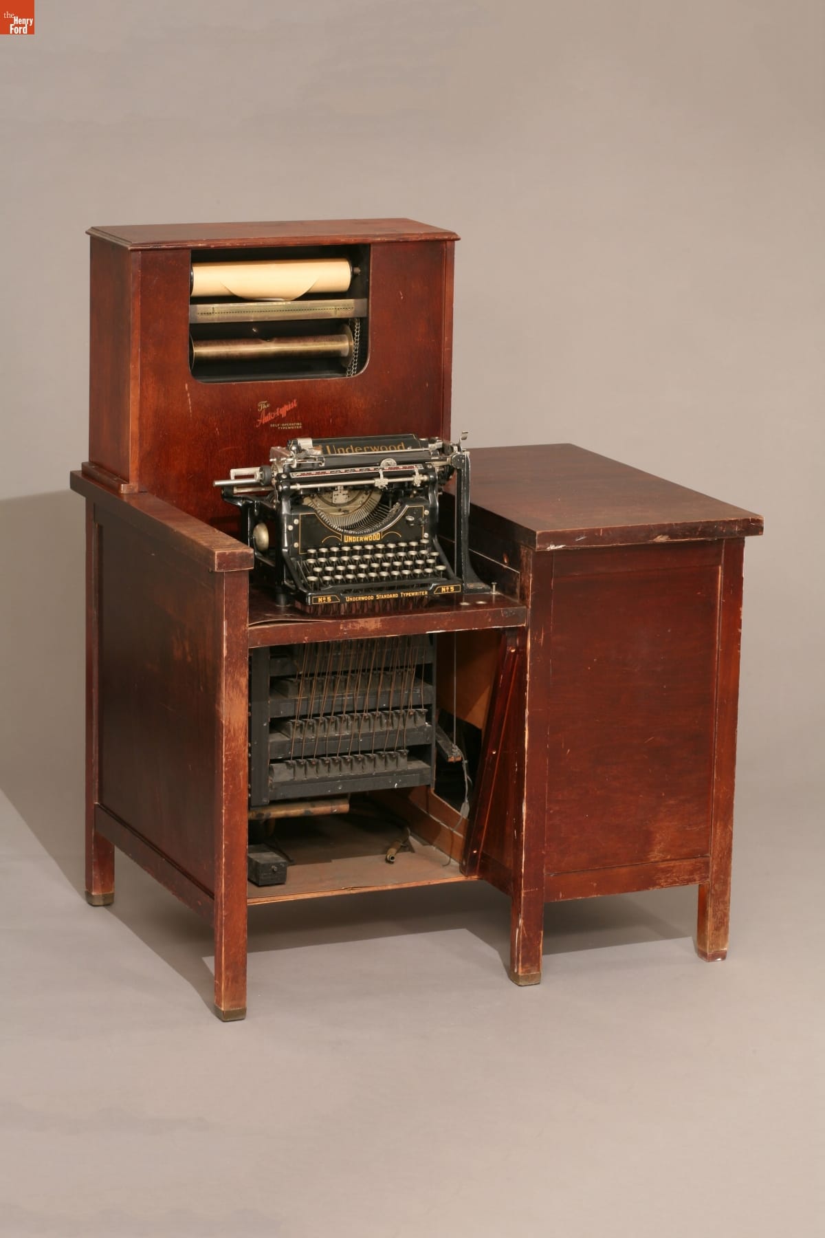 Typewriter made by Underwood Typewriter Co. and cabinet by Macpherson-Eames Mfg. Co. in Chicago, Illinois.