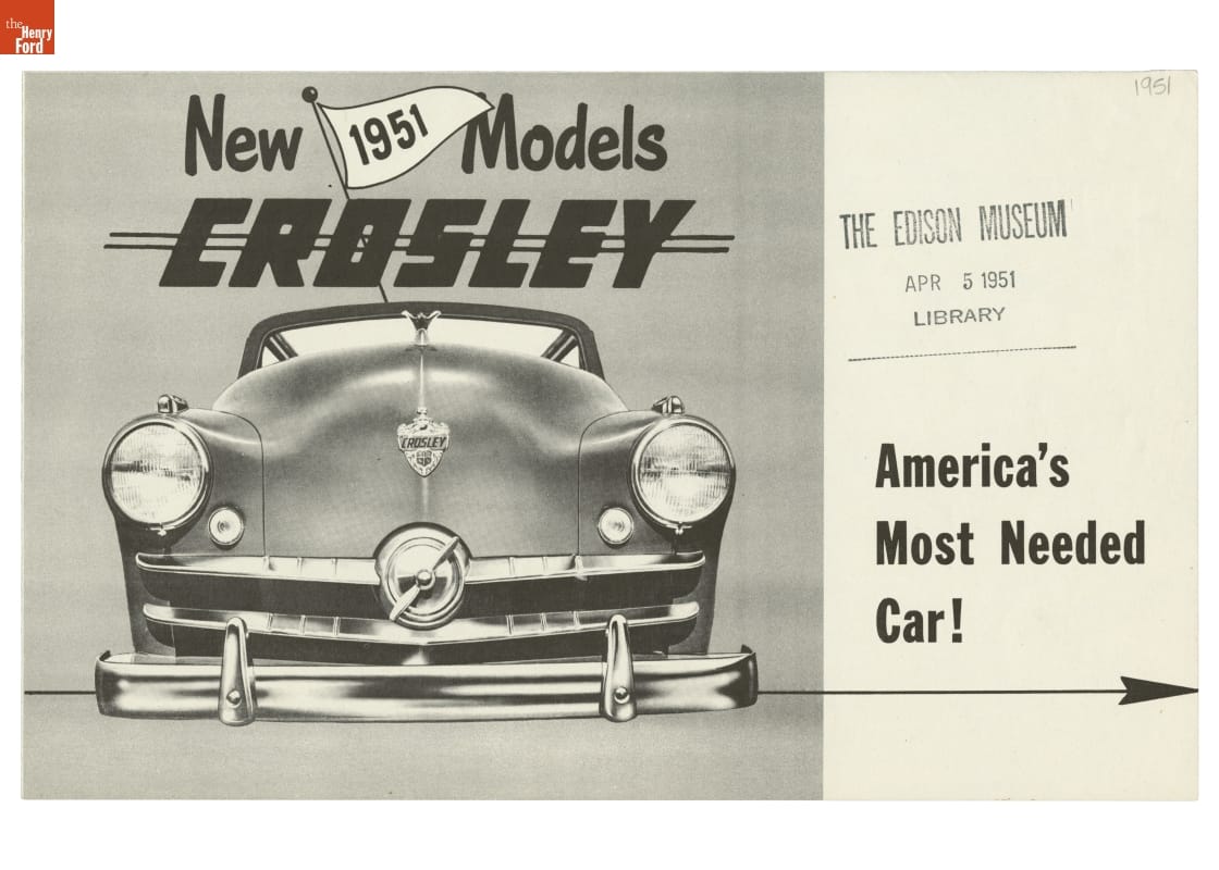 This sales brochure touted the 1951 Crosley as "America's Most Needed Car." Unfortunately for Powel Crosley, head of Crosley Motors Inc., not enough Americans thought they needed his car. Crosley ceased automobile production in 1952.