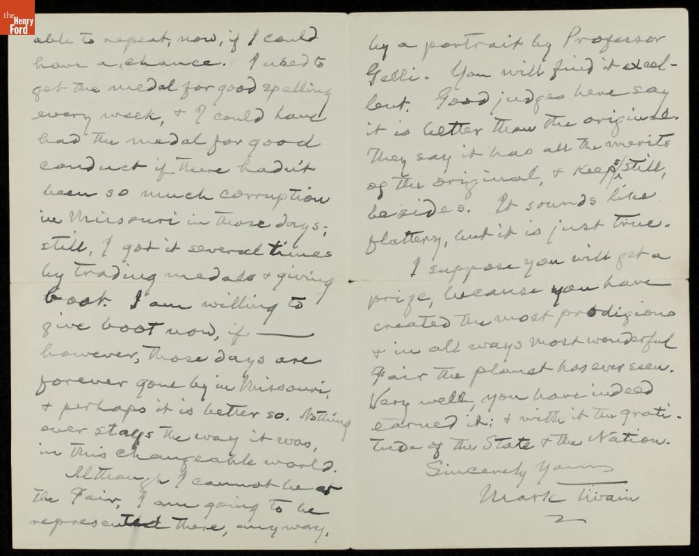 It has been a dear wish of mine to exhibit myself at The Great Fair & get a prize but circumstances beyond my control have interfered, & I must remain in Florence. Although I have never taken prizes anywhere else I used to take them in school in Missouri half a century ago, & I ought to be able to repeat, now, if I could have a chance. I used to get the medal for good spelling every week, & I could have had the medal for good conduct if there hadn't been so much corruption in Missouri in those days, still, I got it several times by trading medals & giving boot. I am willing to give boot now, if--however, those days are forever gone by in Missouri, & perhaps it is better so. Nothing ever stays the way it was, in this changeable world.
