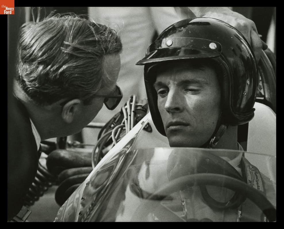 Even though front-engine cars dominated the Indianapolis 500, Dan Gurney (right) believed that a rear-engine Formula One style car could win. In 1962 he brought British F1 designer and Team Lotus founder Colin Chapman (left) together with Ford Motor Company. Chapman's Lotus 38, powered by a rear-mounted Ford V-8, proved Gurney right with an Indy win in 1965.