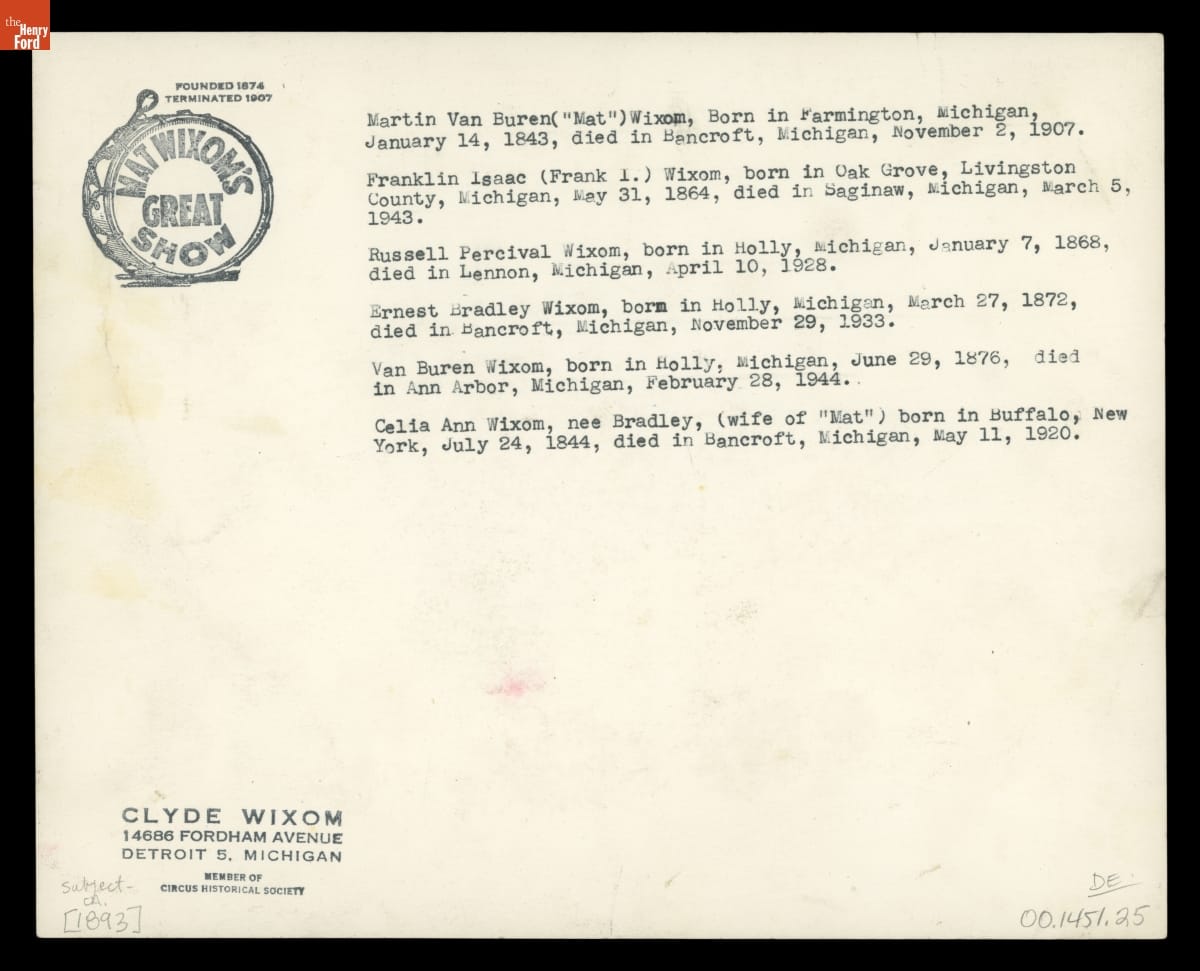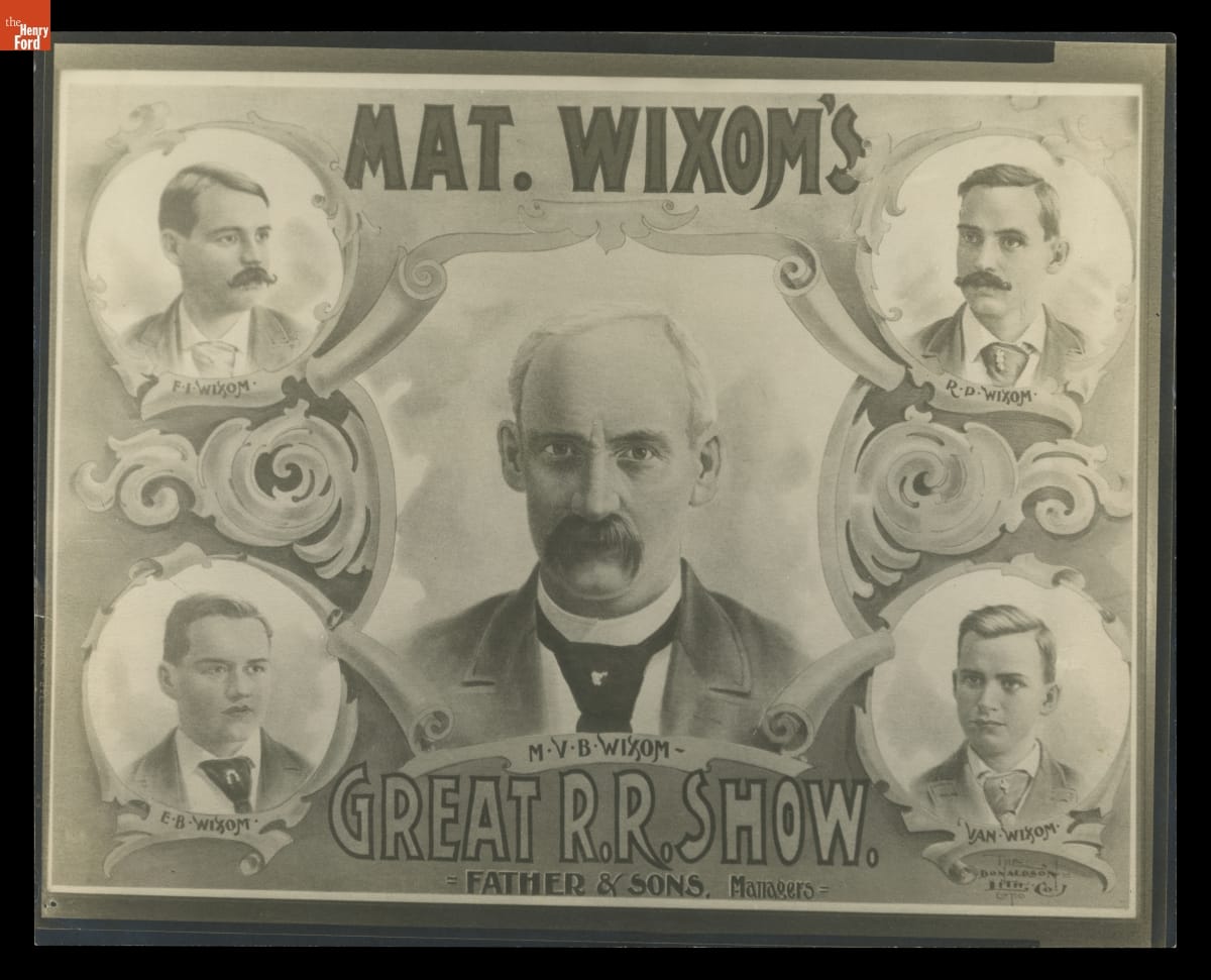 Martin Van Buren "Mat" Wixom was a Michigan-based showman. He and his sons operated a small, regional circus that traveled to mid-Michigan's rural communities between 1874 and 1897. Wixom would create a new gimmick for the circus every year to fuel the audience's anticipation. In 1893, he put up the Great Railroad Show and traveled on a 3-car train throughout the region.