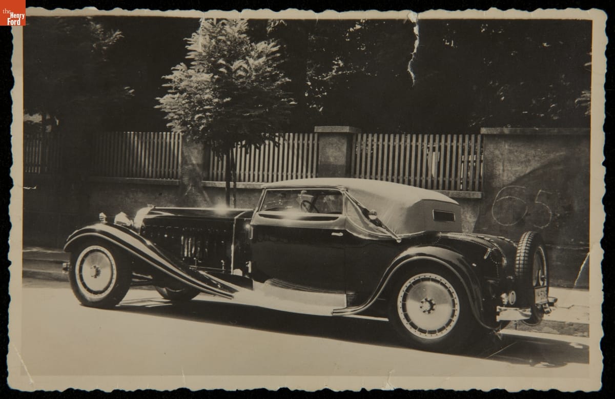 German physician Joseph Fuchs ordered this Bugatti Royale with a body by Ludwig Weinberger of Munich. As finished in 1932, the car was black with yellow trim. Fuchs relocated to the United States where winter cold cracked the engine block. General Motors executive Charles Chayne acquired and restored the Bugatti, altering the colors to oyster white with dark green trim.