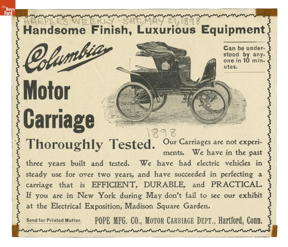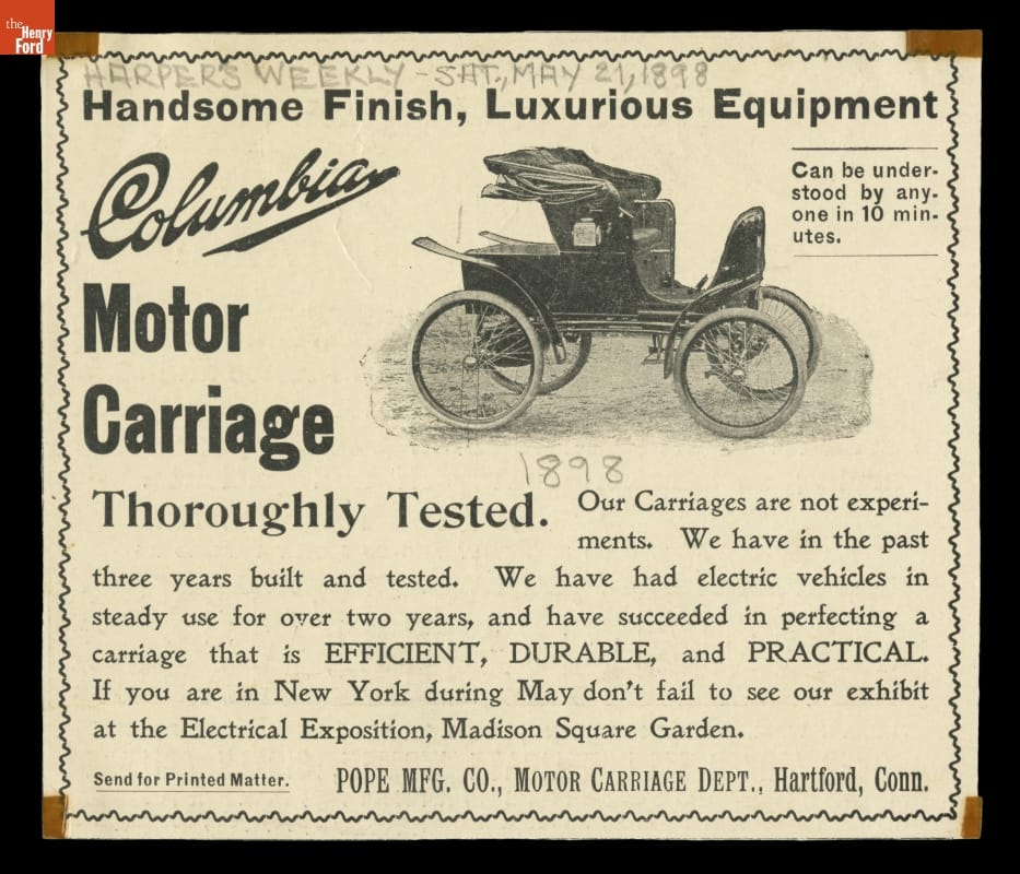 Advertisement for Pope Manufacturing Company's Columbia Motor Carriage, 1898