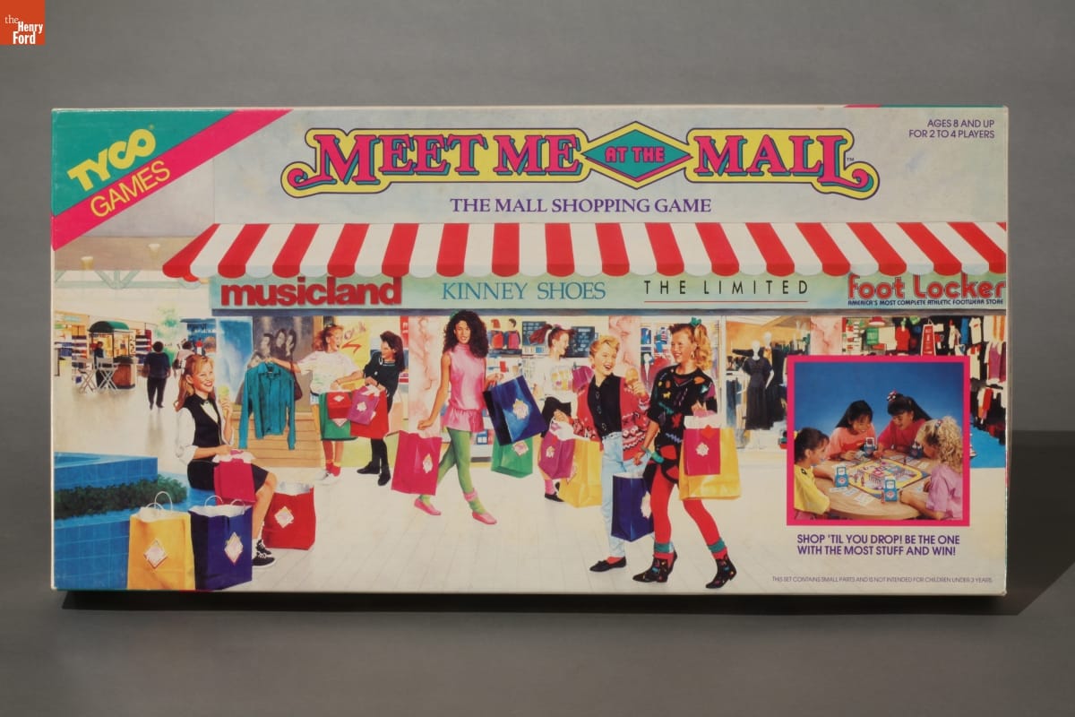 On top of box: TYCO/ GAMES/ MEET ME AT THE MALL/ THE MALL SHOPPING GAME/ AGES 8 AND UP/ FOR 2 TO 4 PLAYERS/SHOP 'TIL YOU DROP! BE THE ONE WITH/ THE MOST STUFF AND WIN!/ THIS SET CONTAINS SMALL PARTS AND IS NOT INTENDED FOR CHILDREN UNDER 3 YEARS