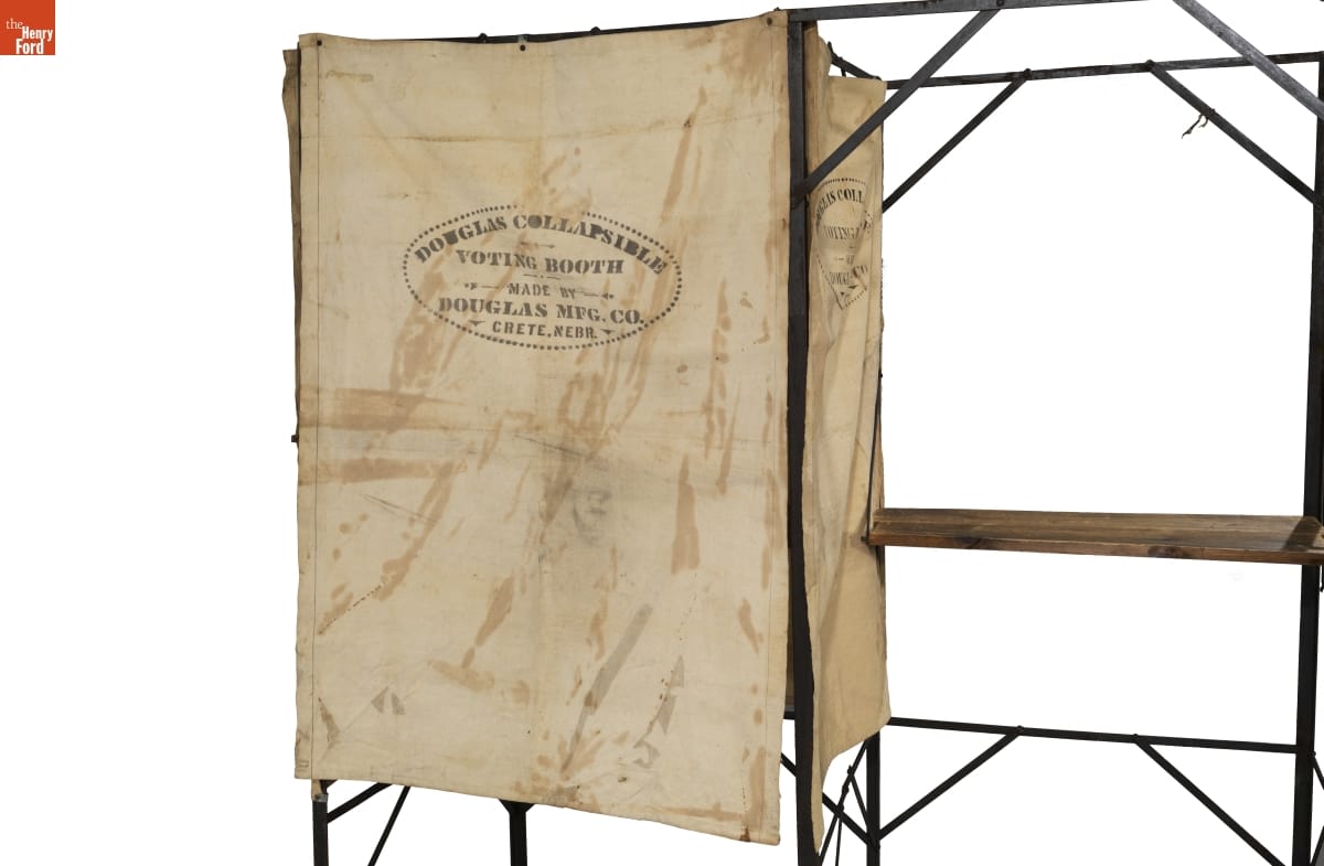 Stenciled on canvas panels: DOUGLAS COLLAPSIBLE / VOTING BOOTH / MADE BY / DOUGLAS MFG. CO. / CRETE, NEB