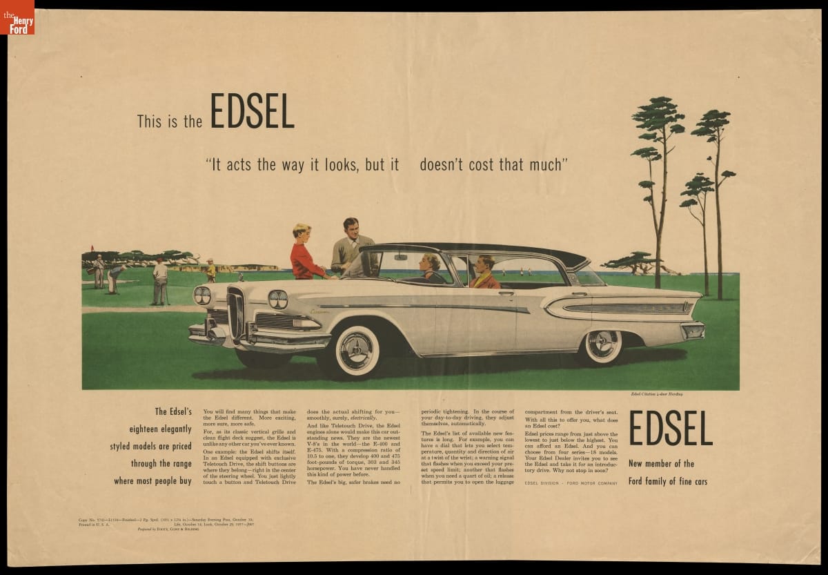 The Edsel offered many styling choices, perhaps too many. And Edsel's marketing only added to the confusion. Consider the slogan from this 1958 Edsel ad, "It acts the way it looks, but it doesn't cost that much." Would you buy an Edsel?