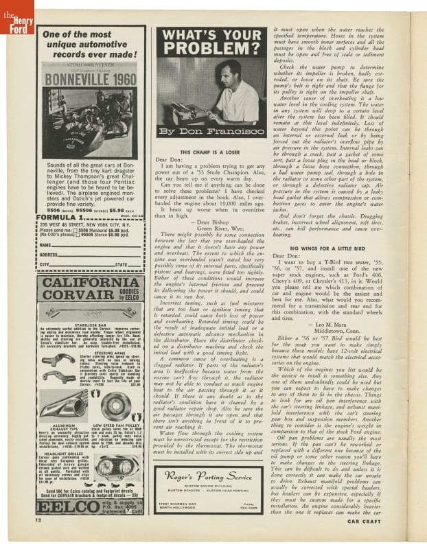 As amateur and professional racing evolved and grew in popularity, publications, like this Car Craft magazine, targeted this new audience. These publications employed experts, like high-performance engine builder Don Francisco, who offered technical advice.
