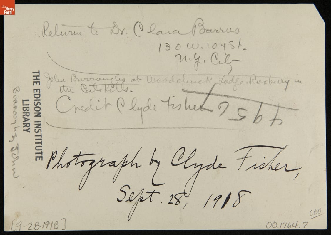 Handwritten in pencil on back: John Burroughs at Woodchuck Lodge, Roxbury in / the Catskills / Credit Clyde Fisher / 49567