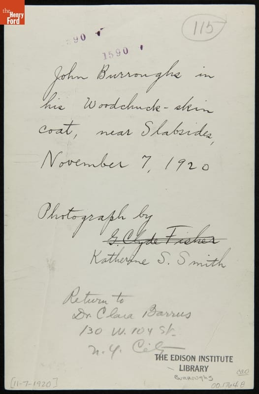 Handwritten in ink on back of image: John Burroughs in / his Woodchuck-skin / coat, near Slabsides, / November 7, 1920 / Photograph by / Katherine S. Smith