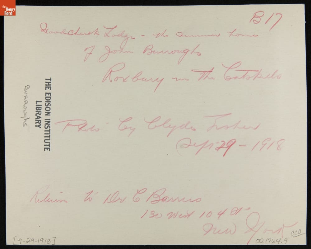 Woodchuck Lodge- the summer home / of John Burroughs / Roxbury in the Catskills / Photo by Clyde Fisher / Sept 29- 1918 / B17