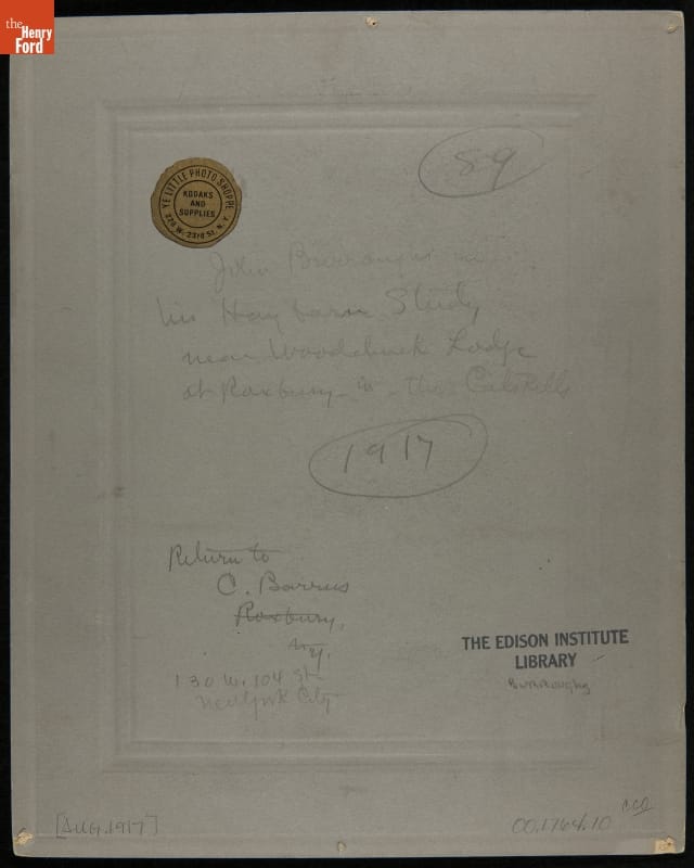 Handwritten in pencil on back of image: John Burroughs in / his Hay-barn Study / near Woodchuck Lodge / at Roxbury in the Catskills / 59