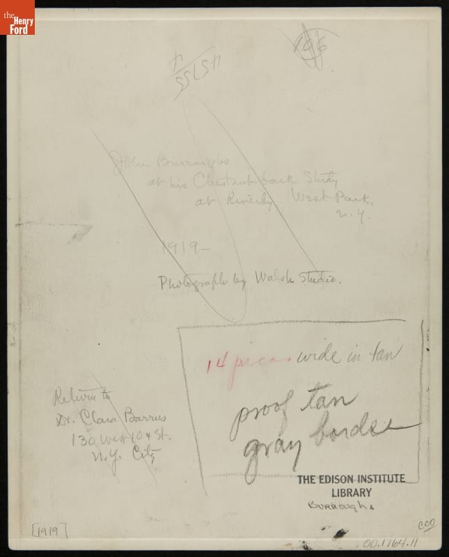 John Burroughs / at his Chestnut bark Study / Riverby, West Park, N.Y. / 1919 / Photograph by Walsh Studio / 45755/4
