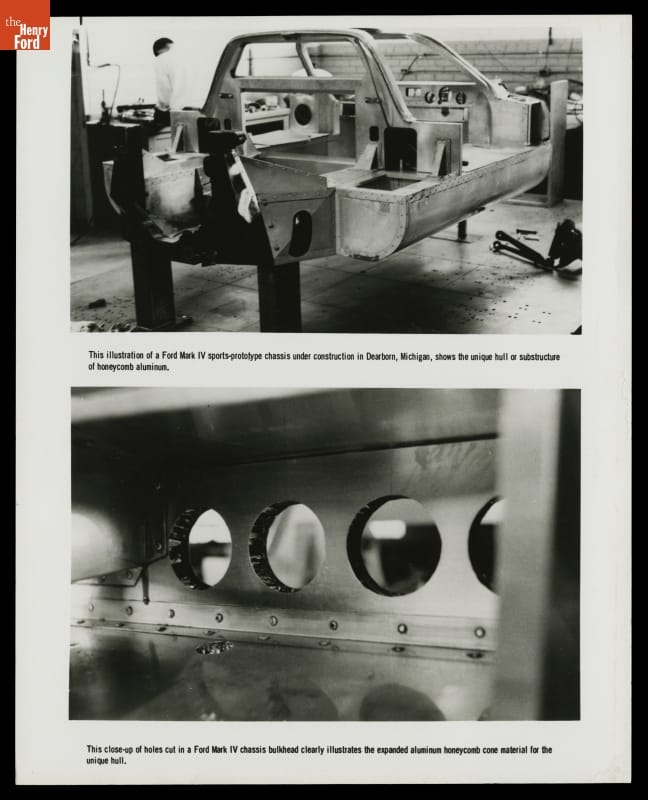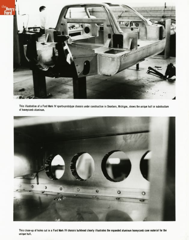 Bottom image reads: This close-up of holes cut in a Ford Mark IV chassis bulkhead clearly illustrates the expanded aluminum honeycomb material for the / unique hull.