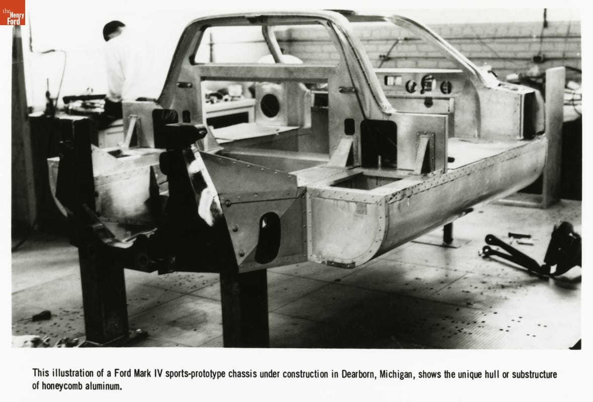 Holes cut in the chassis of a Ford Mark IV show its aircraft-style construction of aluminum honeycomb. The concept was to make it strong and lightweight. Ford cars earned four consecutive Le Mans victories starting in 1966.