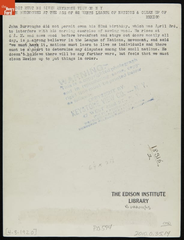 John Burroughs on His 82nd Birthday, Yama Farms, New York, April 3, 1919
