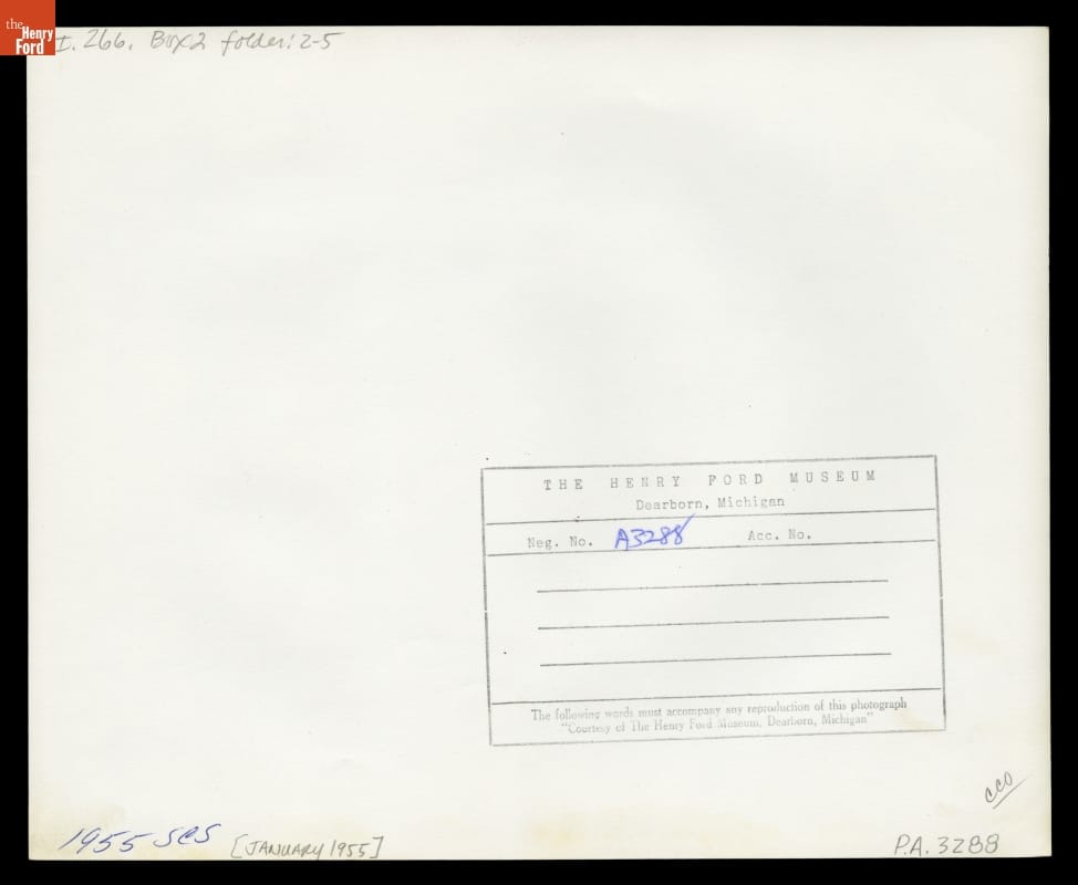 Black ink stamp on back of image is from The Henry Ford Museum, Neg. No. A3288