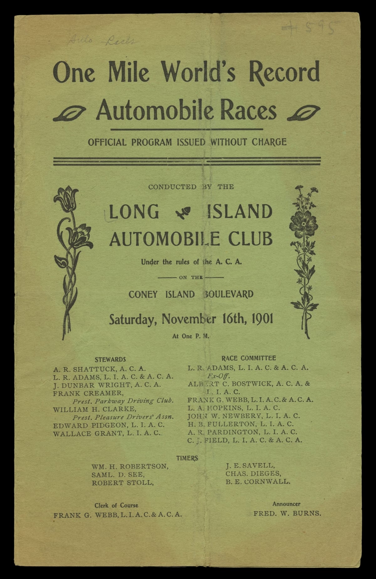 Program for "One Mile World's Record Automobile Races," Brooklyn, New York, November 16, 1901