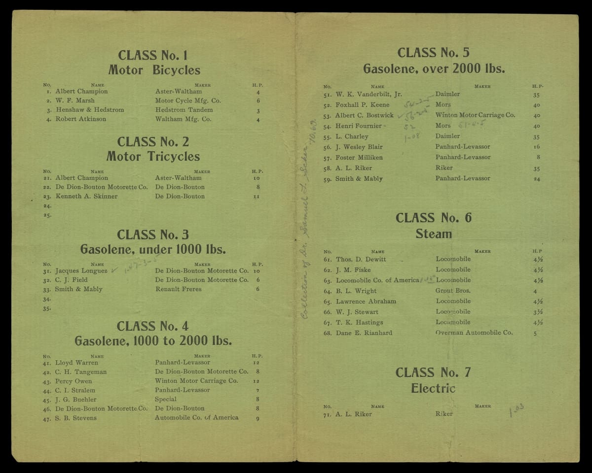 Inside program Class lists include: CLASS No. 1 Motor Bicycles; CLASS No. 2 Motor Tricycles; CLASS No. 3 Gasolene (sic) under 1000 lbs.; CLASS No. 4 Gasolene (sic) 1000 to 2000 lbs;