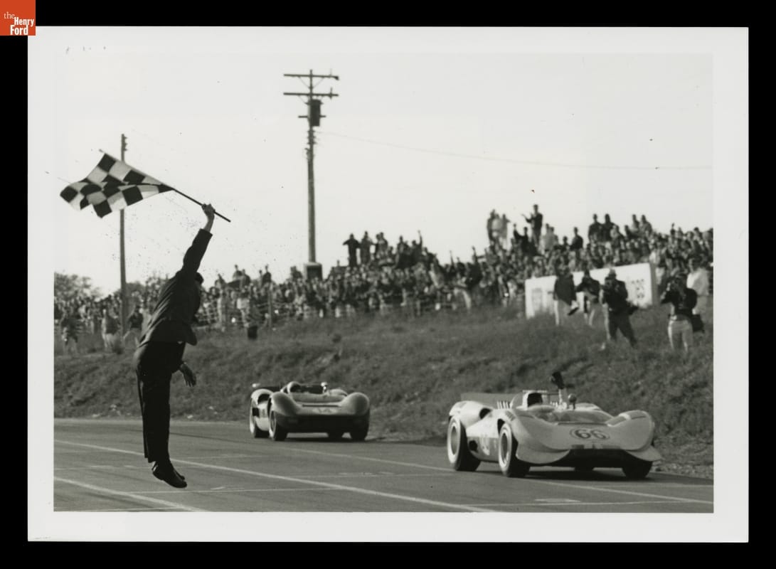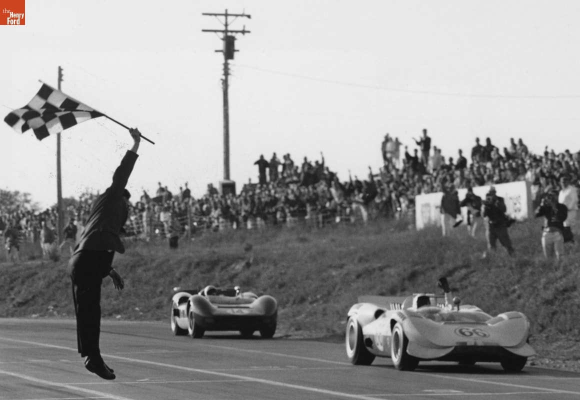 Jim Hall in a Chaparral and Bruce McLaren Taking the Flag at Mosport International Raceway, Ontario, Canada, September 1965