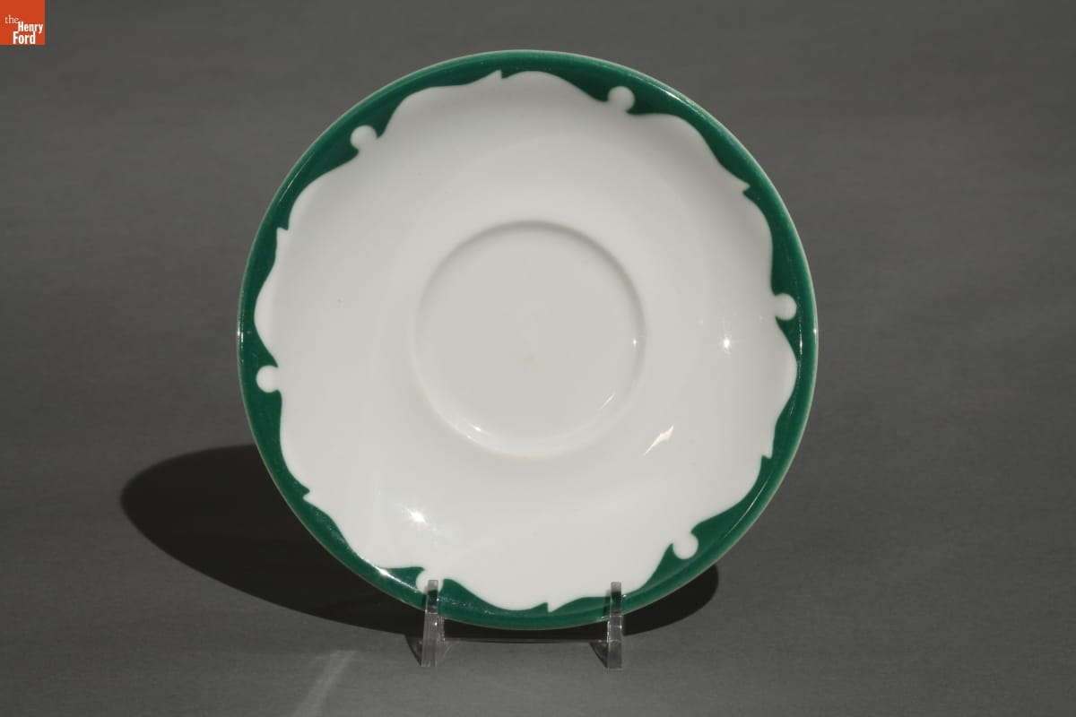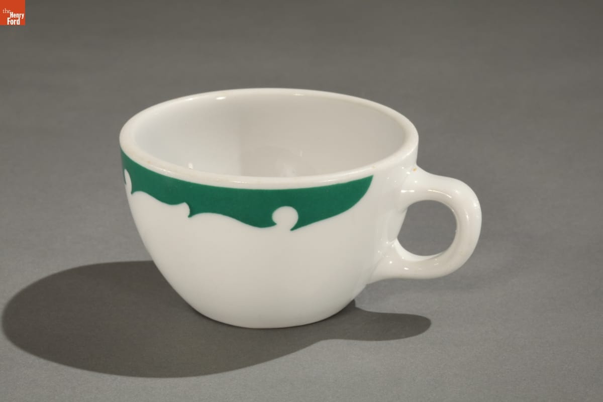As more Americans hit the roads in the early and mid-1900s they needed a reliable place to stop and eat. Roadside diners promised quick, informal dining at reasonable prices. Proprietors served meals on clean, strong, yet visually pleasing china. This cup and saucer with its colorful green border was made by the Shenango China Company of New Castle, Pennsylvania.