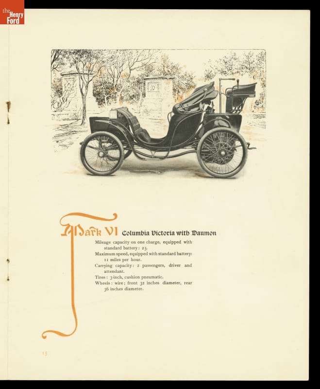 This 1901 sales catalog for Columbia electric vehicles illustrates various models and their specifications. One important detail for potential buyers was the mileage capacity on a single charge.