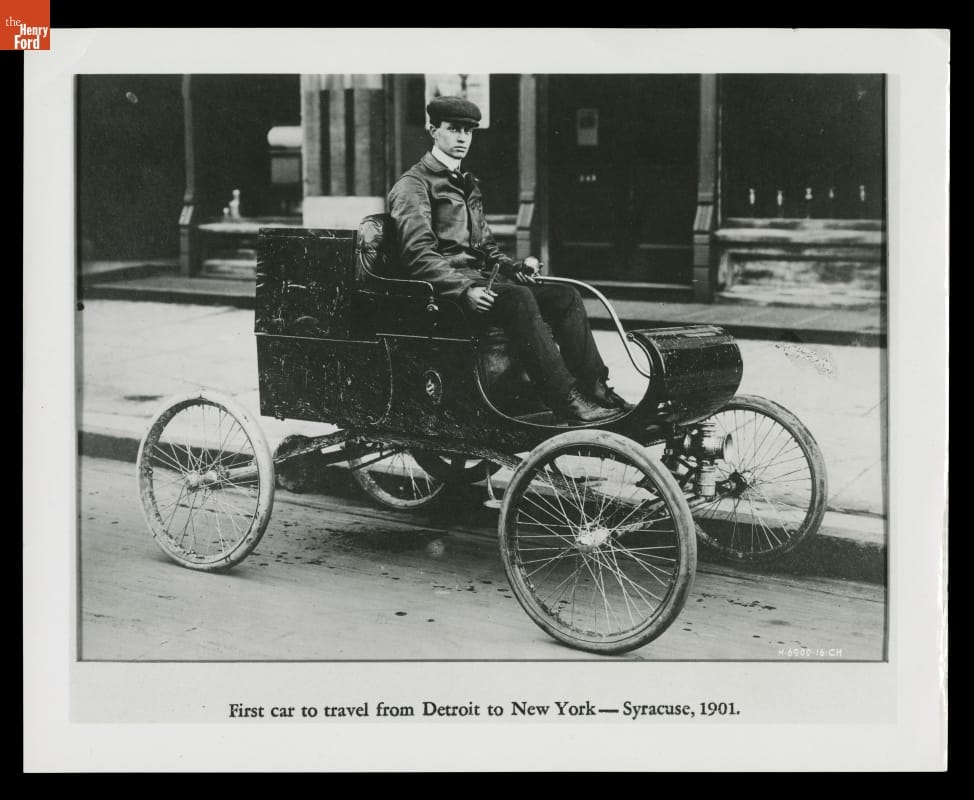 Olds Motor Works sent Roy Chapin, Sr., on a promotional trip from Detroit to New York City in a small Curved Dash Olds in 1901. The trip took the car and driver, seen in this photograph, through Canada, along the Erie Canal, down Fifth Avenue, and finally to the Waldorf-Astoria Hotel. The eventful trip took over a week.
