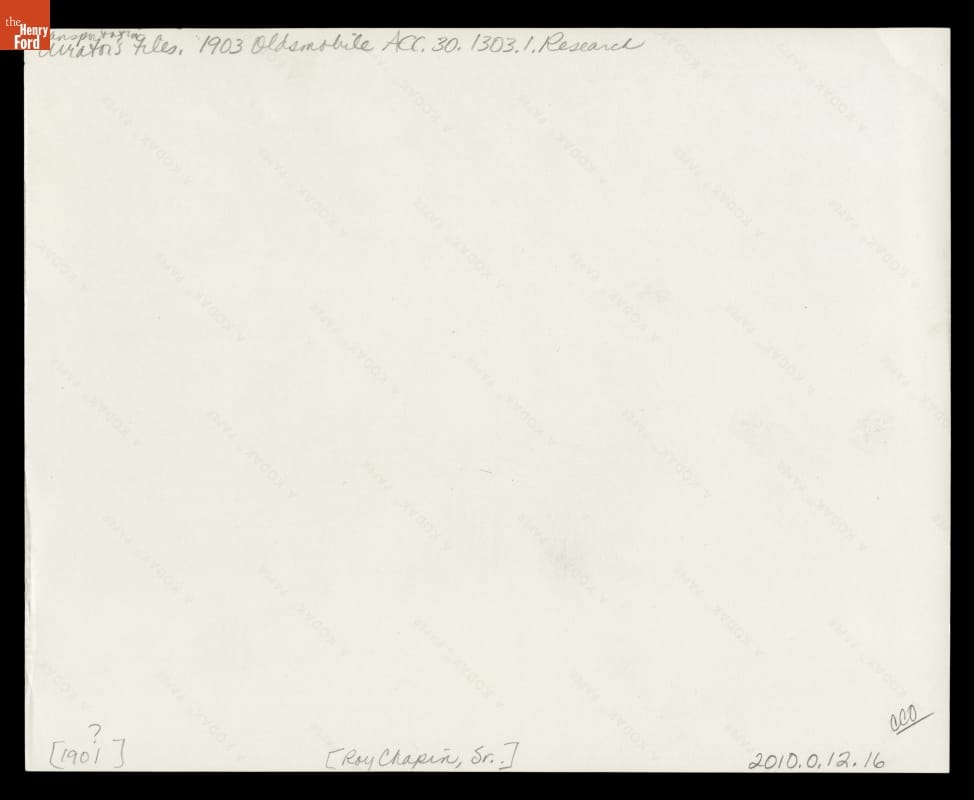 Roy D. Chapin Seated in Curved-Dash Oldsmobile, "First Car to Travel from Detroit to New York--Syracuse, 1901"