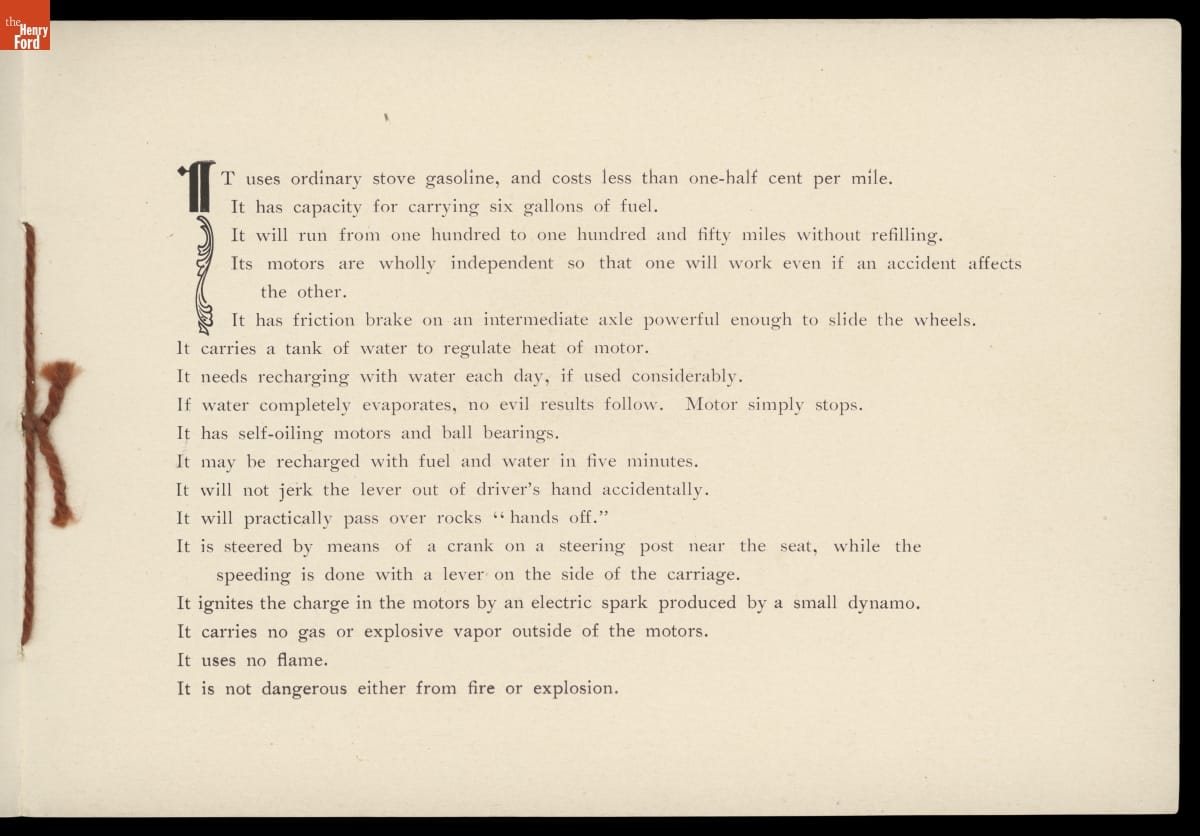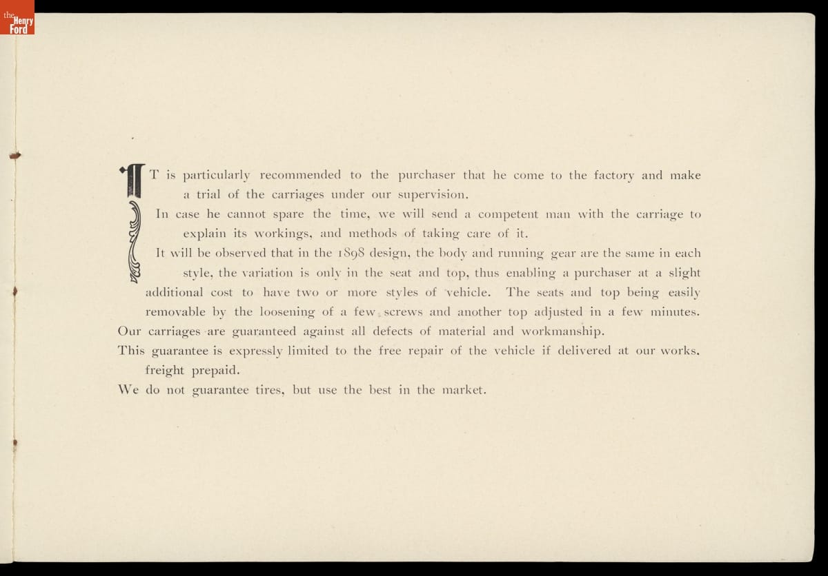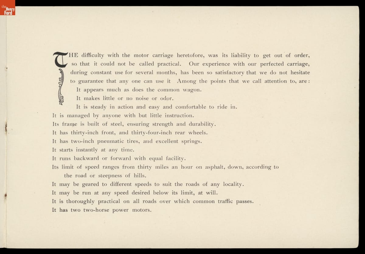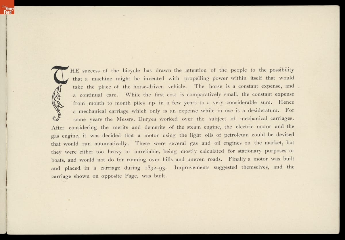 The Duryea Motor Wagon Company's sales literature for 1898 focused on how to drive and maintain the vehicle, reassuring potential buyers that the vehicle would not explode.