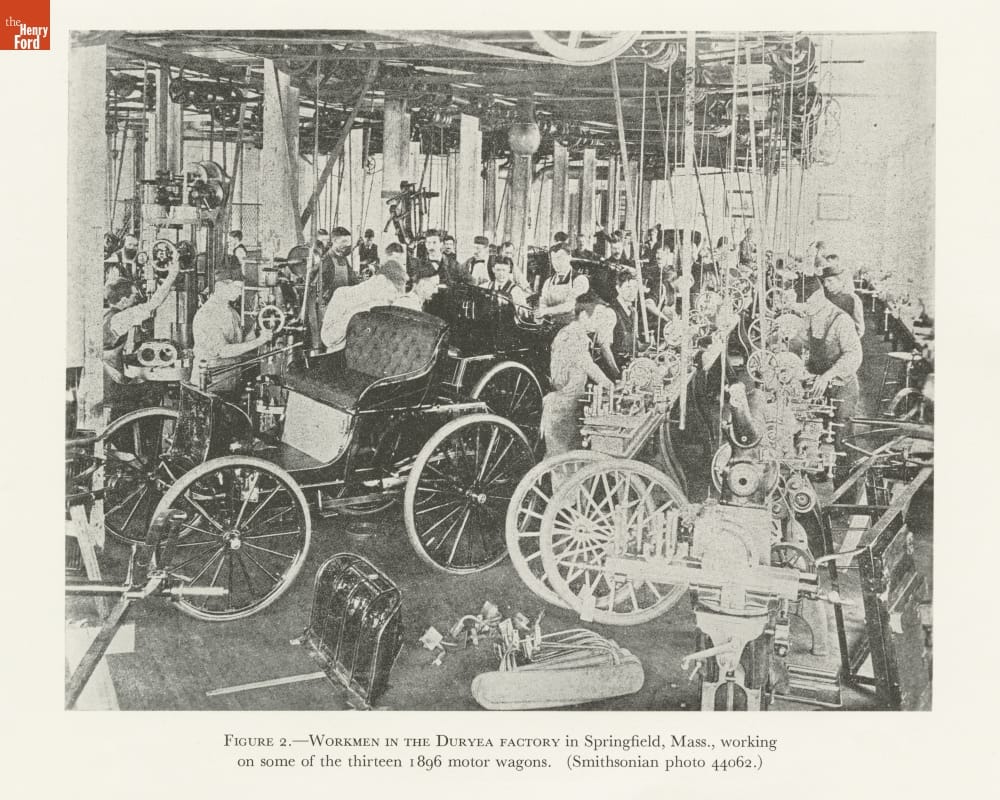 Charles and Frank Duryea built their first automobile in 1893. Three years later the brothers established the Duryea Motor Wagon Company. The company built thirteen identical vehicles in its first year. This Smithsonian Institution publication contains a photograph of factory employees working on some of the thirteen vehicles.