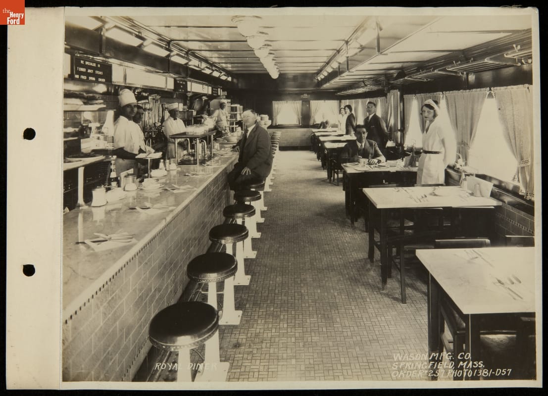 Entrepreneurs could start a business easily by purchasing a fully outfitted diner. Wason Manufacturing Company, a noted streetcar and railway passenger vehicle manufacturer, produced the Royal Diner in Los Angeles, California, pictured here. Owners wanting to attract women and families purchased diners with space for tables or booths with more comfortable seating and hired waitresses to serve customers.