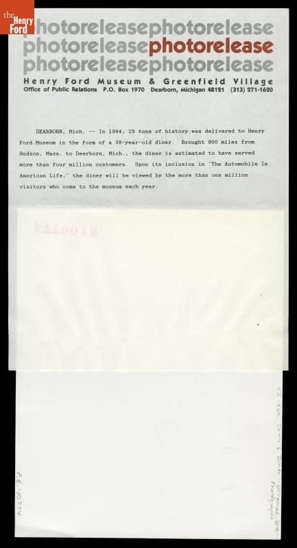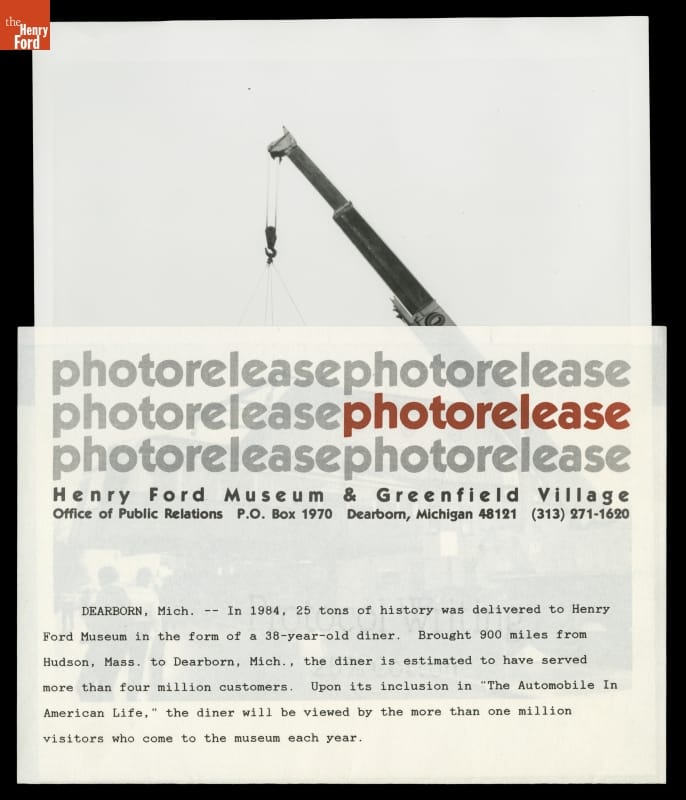 Henry Ford Museum & Greenfield Village... / ...DEARBORN, MICH. -- In 1984, 25 tons of history was delivered to Henry Ford Museum in the form of a 38-year-old diner. Brought 900 miles from Hudson, Mass. to Dearborn, Mich., the diner is estimated to have served more than four million customers. Upon its inclusion in "The Automobile In American Life," the diner will be viewed by the more than one million visitors who come to the museum each year.