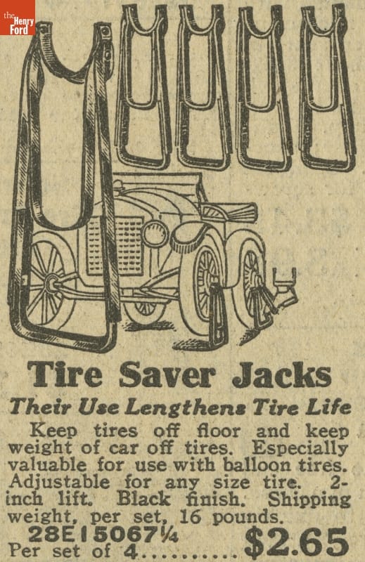 Sears, Roebuck and Company provided a variety of automobile-related products for motorists. This 1926 catalog contains an ad for jack stands. Some people simply didn't drive their open cars in winter; open cars had no permanent roofs and exposed riders to the elements. Jack stands kept tires from getting flat spots.