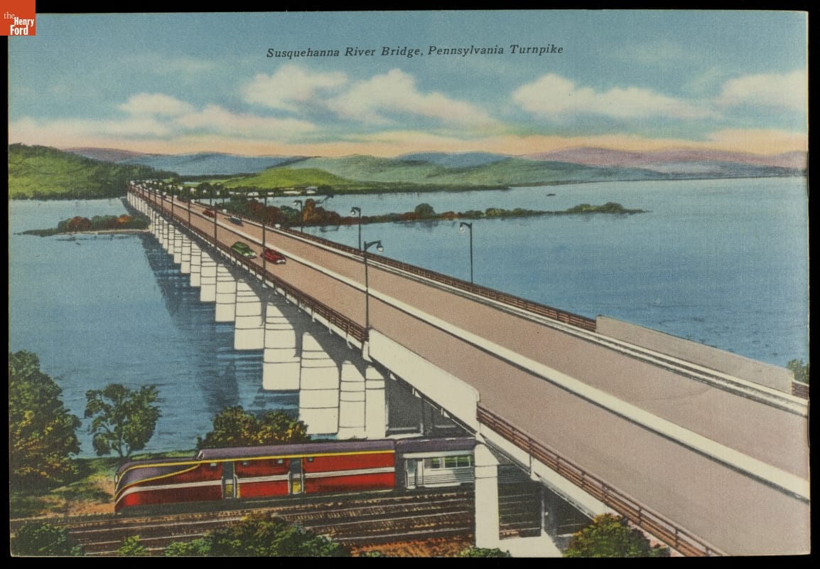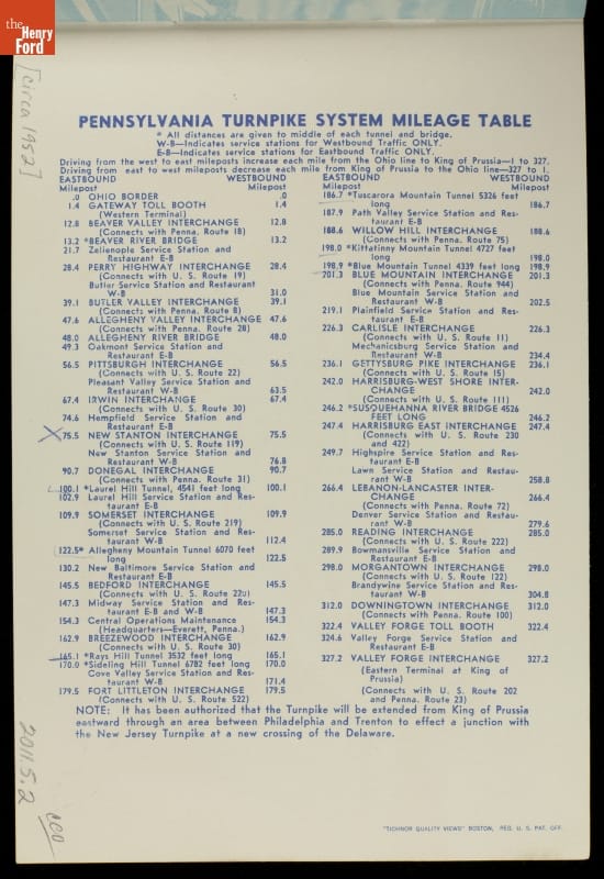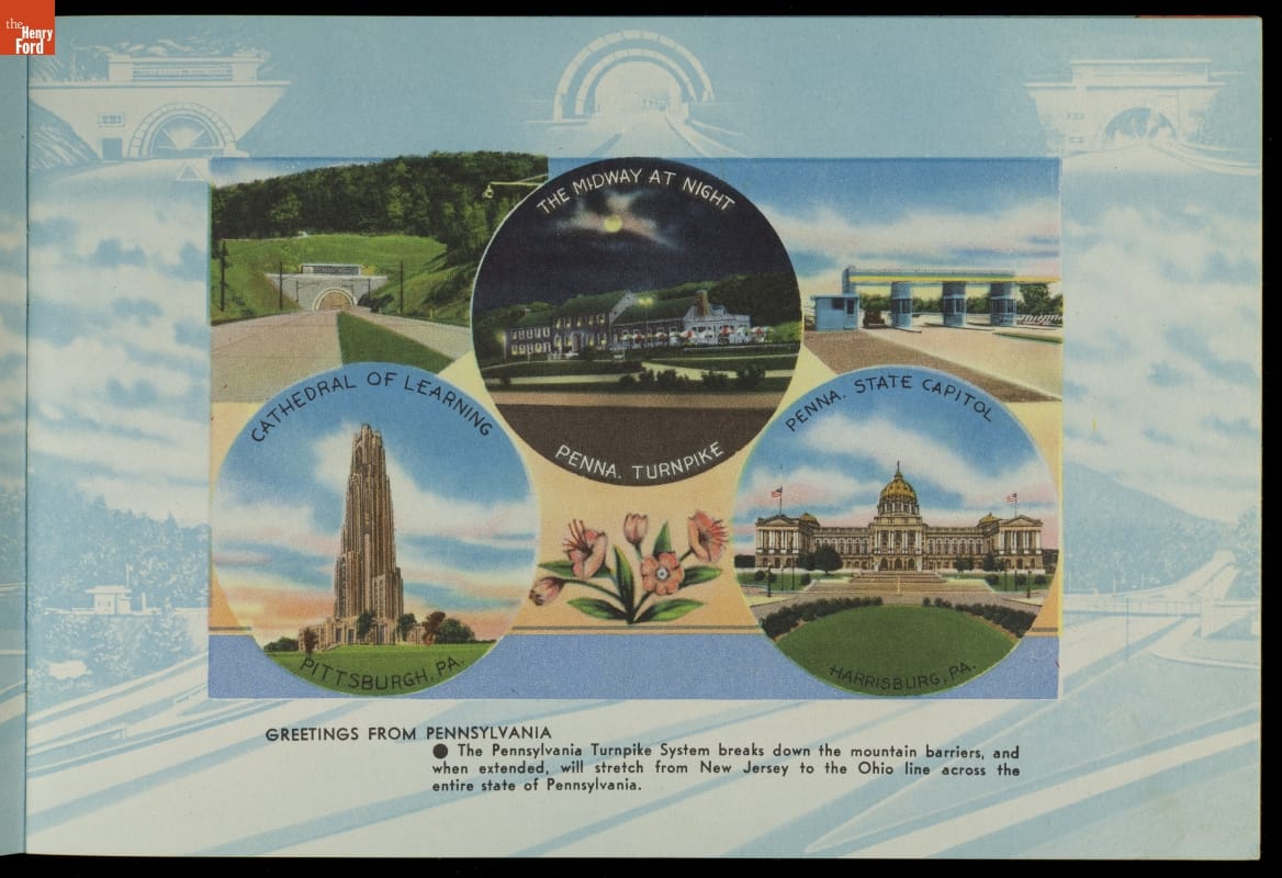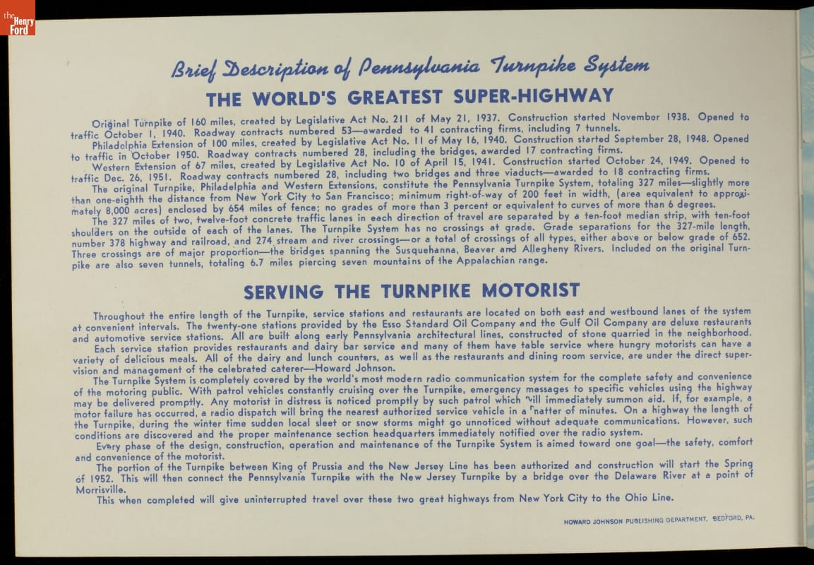 Drivers could remember their travels on the Pennsylvania Turnpike with this souvenir booklet. Published by Howard Johnson's, the book contains scenic images of the turnpike and the service stations with Howard Johnson's restaurants.