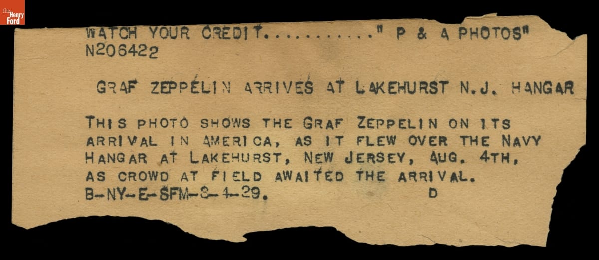 WATCH YOUR CREDIT..... "P & A PHOTOS" / N206422 / GRAF ZEPPELIN ARRIVES AT LAKEHURST N.J. HANGAR / THIS PHOTO SHOWS THE GRAF ZEPPELIN ON ITS / ARRIVAL IN AMERICA, AS IT FLEW OVER THE NAVY HANGAR AT LAKEHURST, NEW JERSEY, AUGUST 4TH, / AS CROWD AT FIELD AWAITED THE ARRIVAL. / B-NY-E-SFM- 8-4-29 D