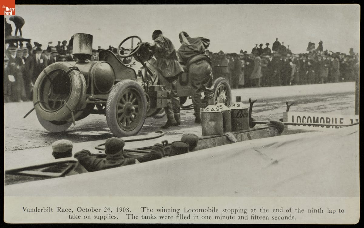 Vanderbilt Race, October 24, 1908. The winning Locomobile stopping at the end of the ninth lap to / take on supplies. The tanks were filled in one minute and fifteen seconds.