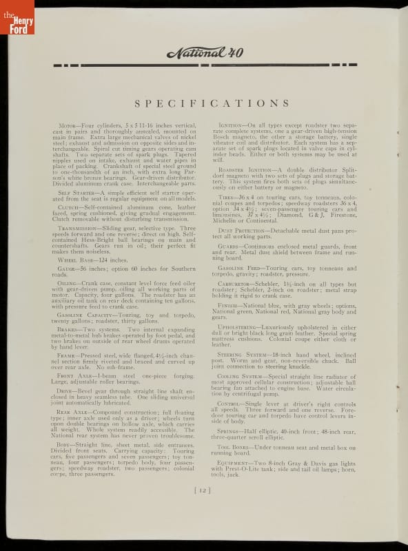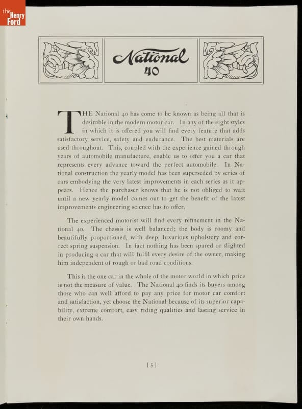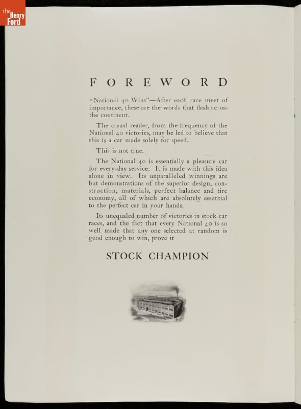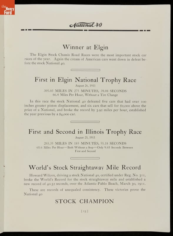1912 National Motor Vehicle Co. Sales Brochure, "National 40 Stock Champion"