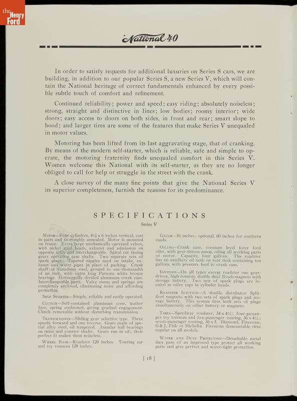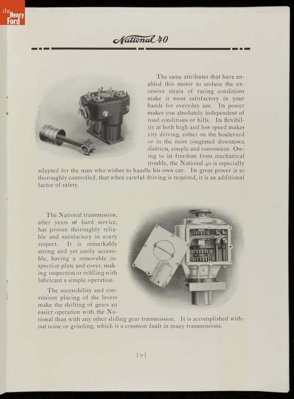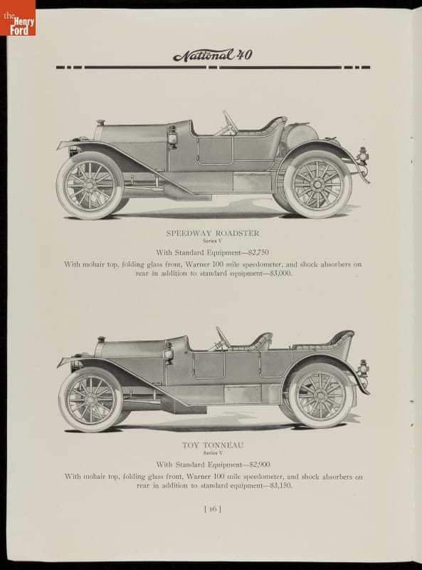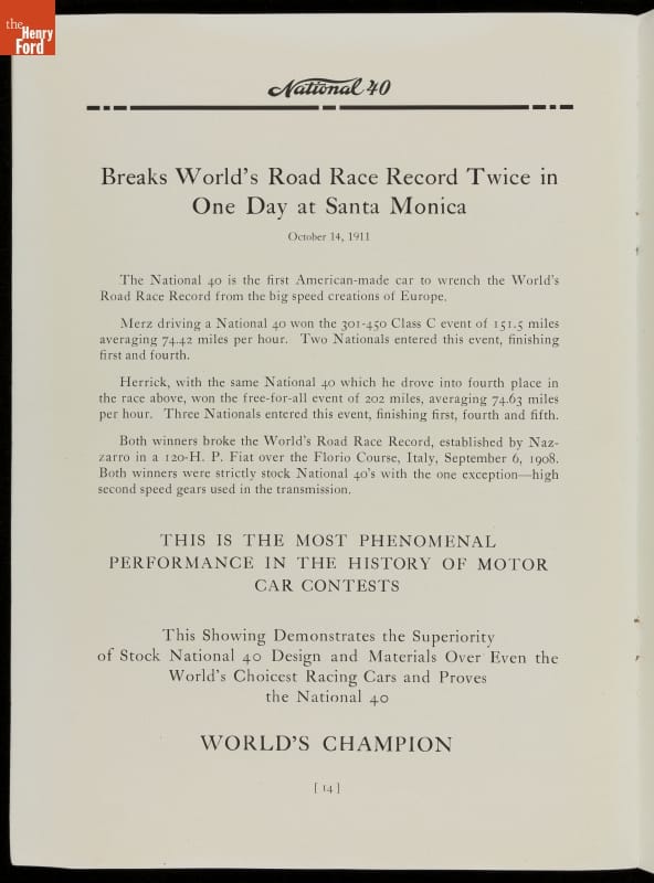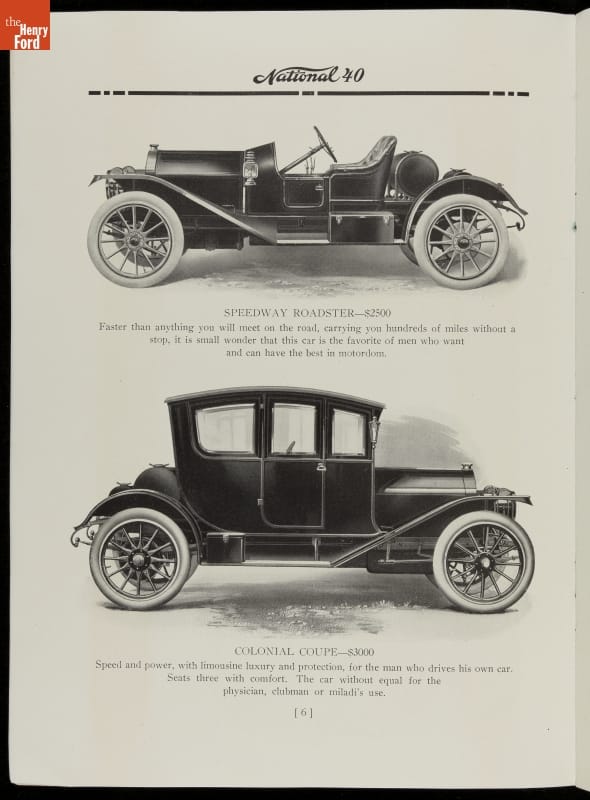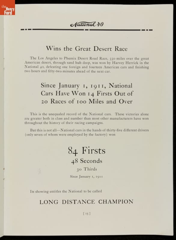 From the beginning, automakers realized the promotional value in motorsports. Cars from the National Motor Vehicle Company of Indianapolis earned multiple racing victories, including one at the 1912 Indianapolis 500 with driver Joe Dawson. But this brochure was quick to point out that the National wasn't "a car made solely for speed." It was a practical automobile for everyday use too.