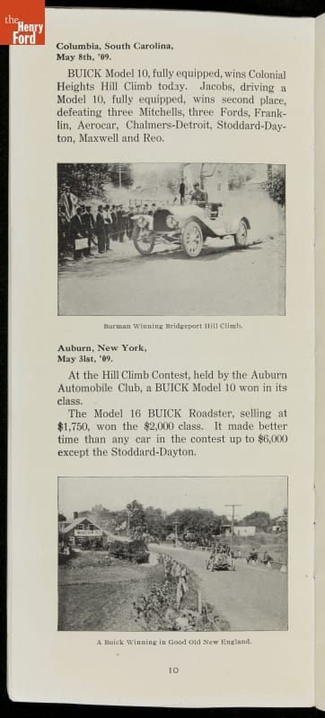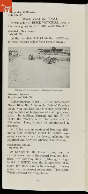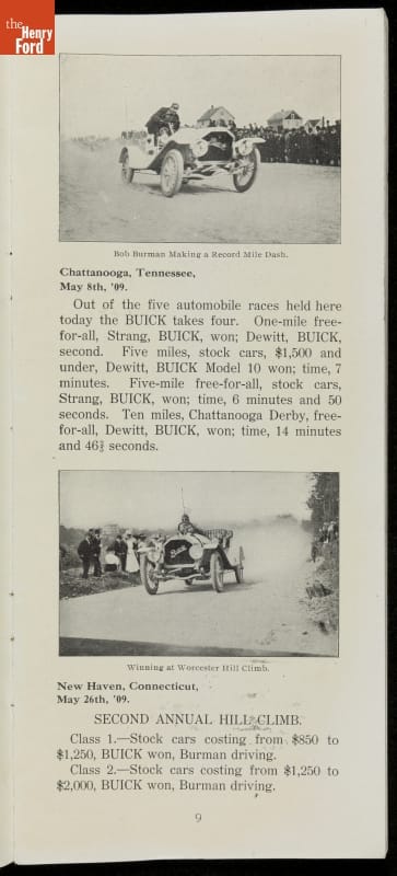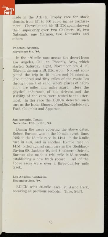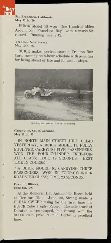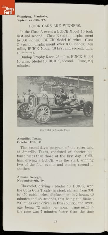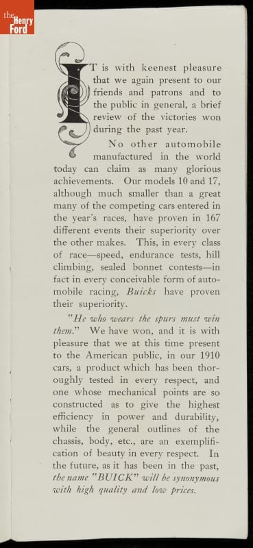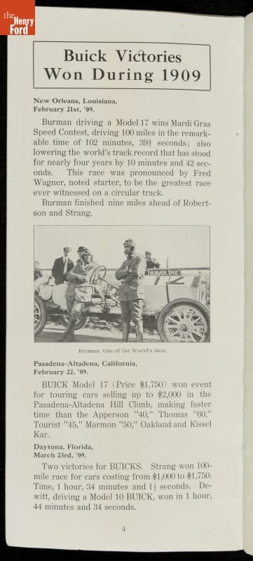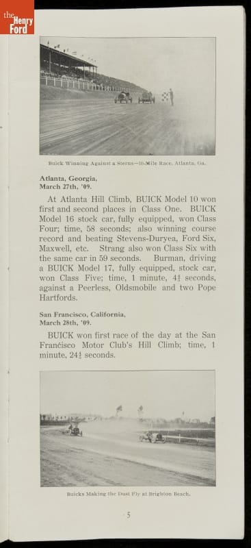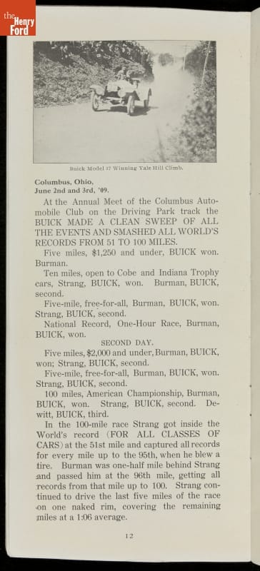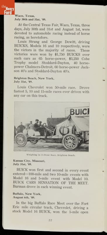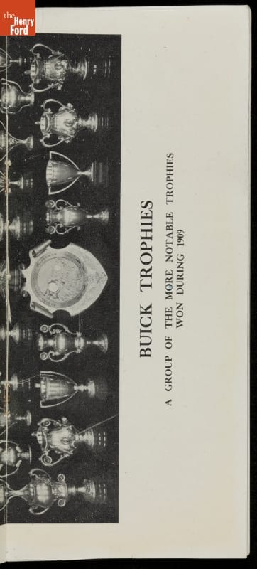 In the auto industry's early years, racing offered an excellent opportunity for a manufacturer to promote its vehicles. Success on the race track testified to a car's speed, power and durability. This brochure celebrated Buick's motorsports accomplishments in the 1909 racing season -- while still insisting that "our customers are our best salesmen."