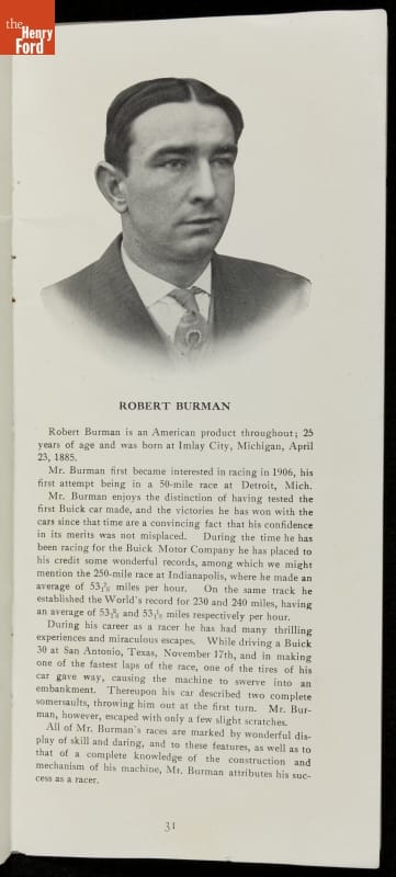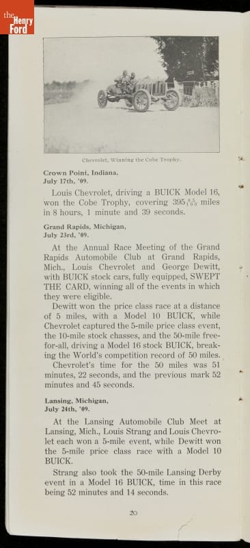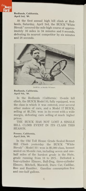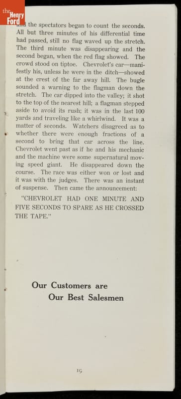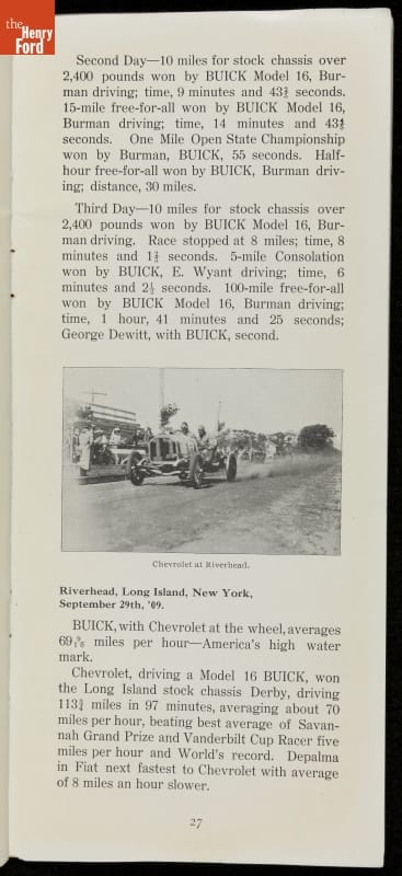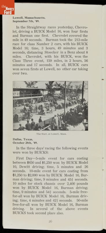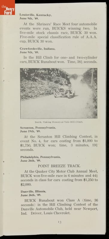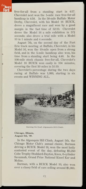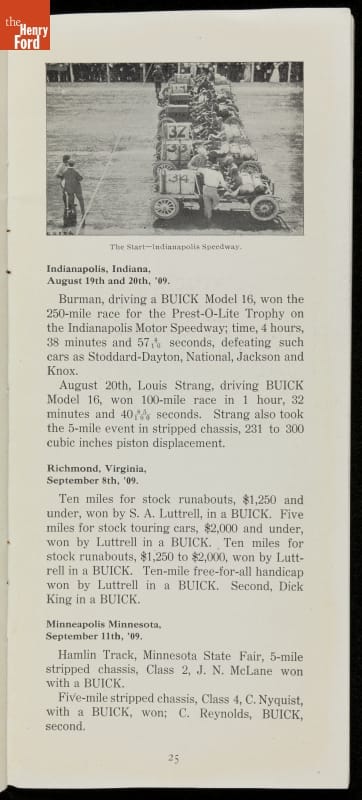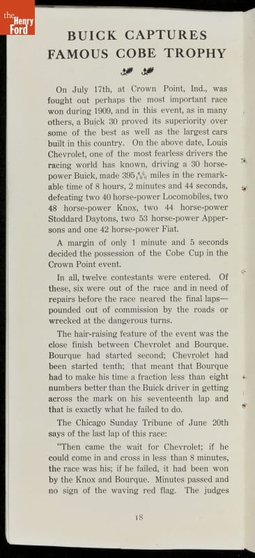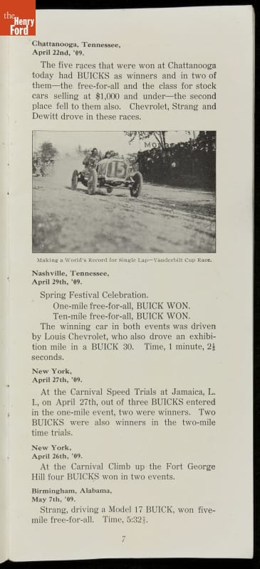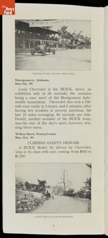 In the auto industry's early years, racing offered an excellent opportunity for a manufacturer to promote its vehicles. Success on the race track testified to a car's speed, power and durability. This brochure celebrated Buick's motorsports accomplishments in the 1909 racing season -- while still insisting that "our customers are our best salesmen."